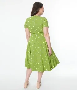 Unique Vintage Plus Size Green & White Dot Short Sleeve Delores Swing Dress