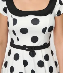 Unique Vintage Ivory & Black Dot Contrast Collared Swing Dress