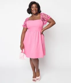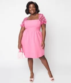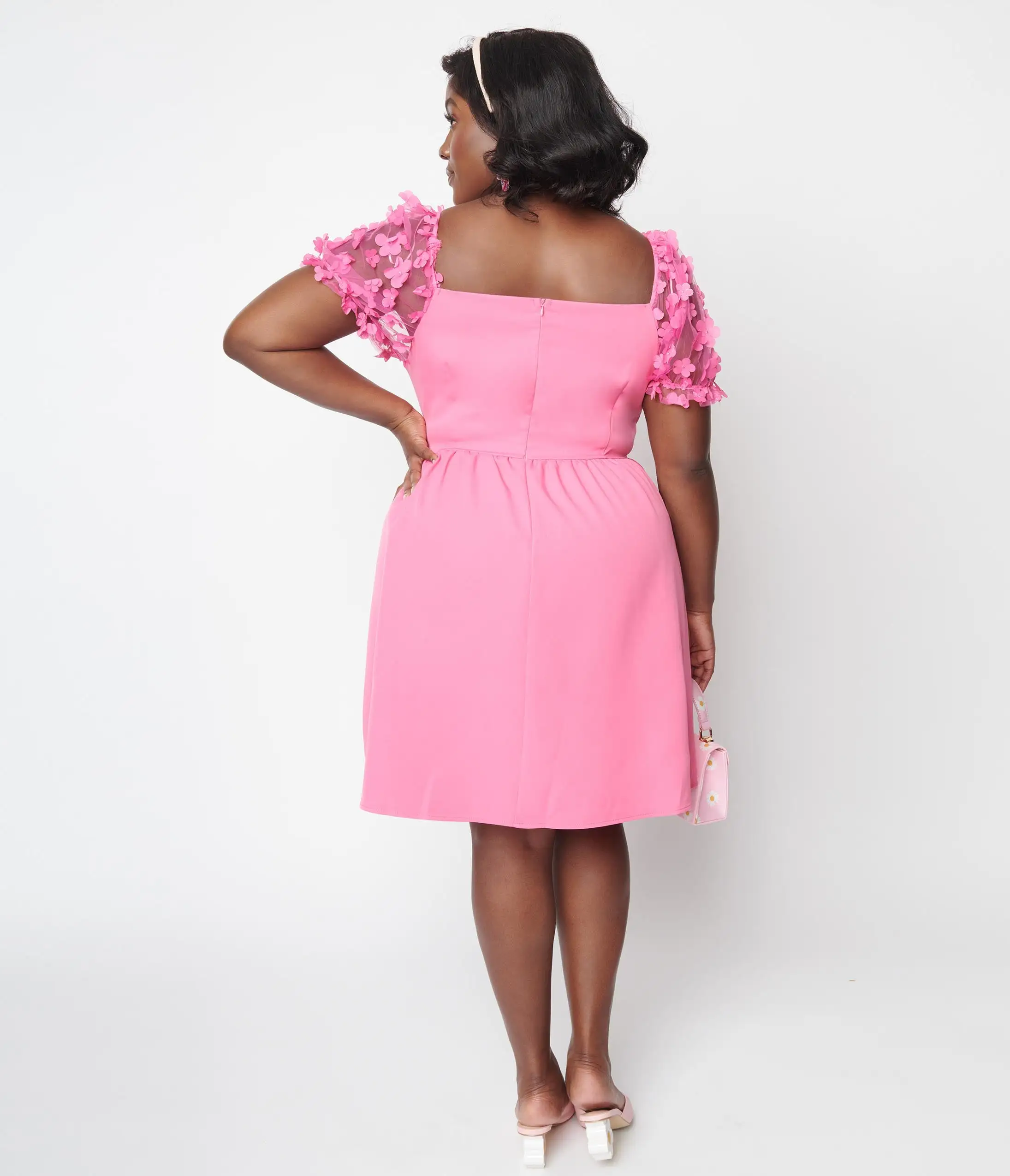 Pop out in style with this charming fit and flare dress crafted in a gorgeous hot pink knit. Outfitted with an adorable pair of mesh puff sleeves adorned in floral appliques. Complete with a back zipper for ease!
