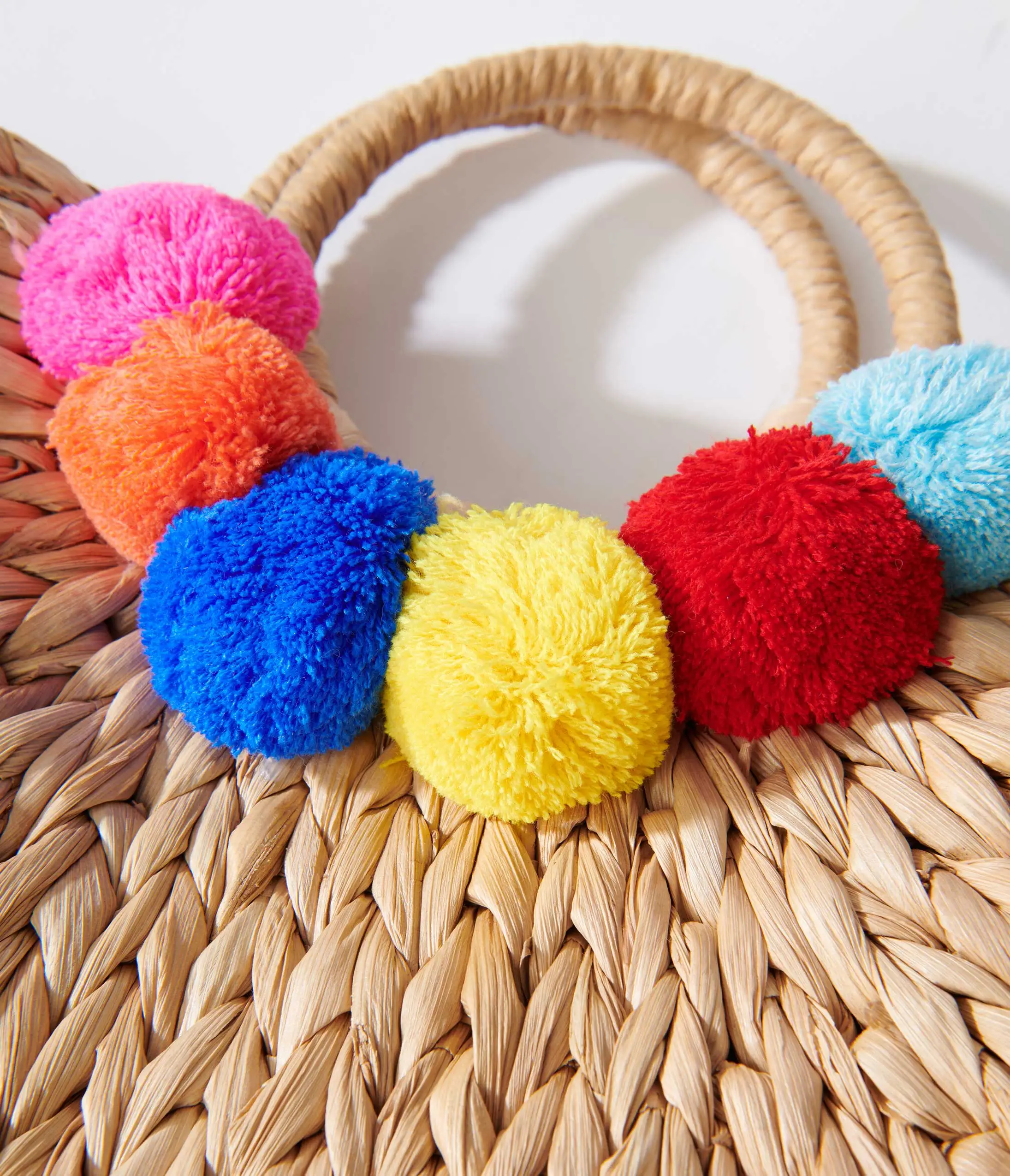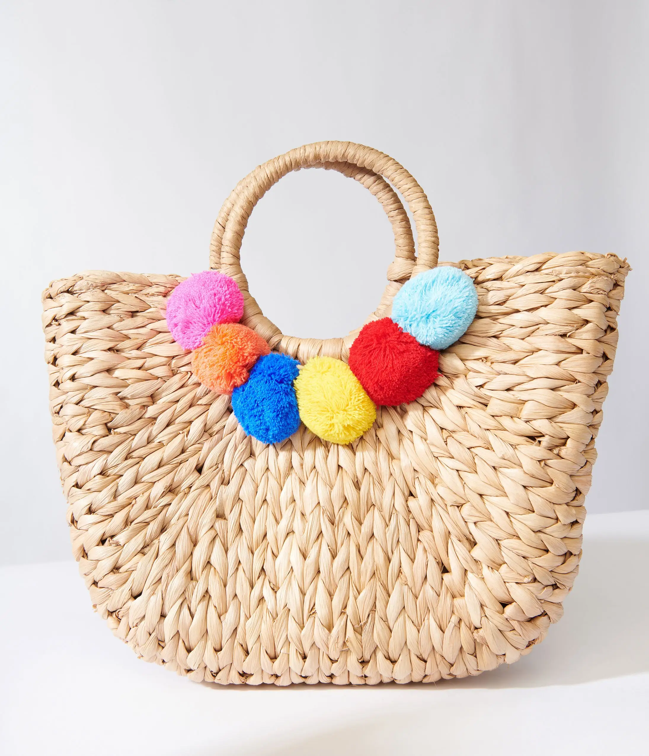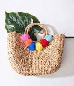 Tan woven straw handbag with multicolored pompoms. Braided circle handles. Complete with inner lining.