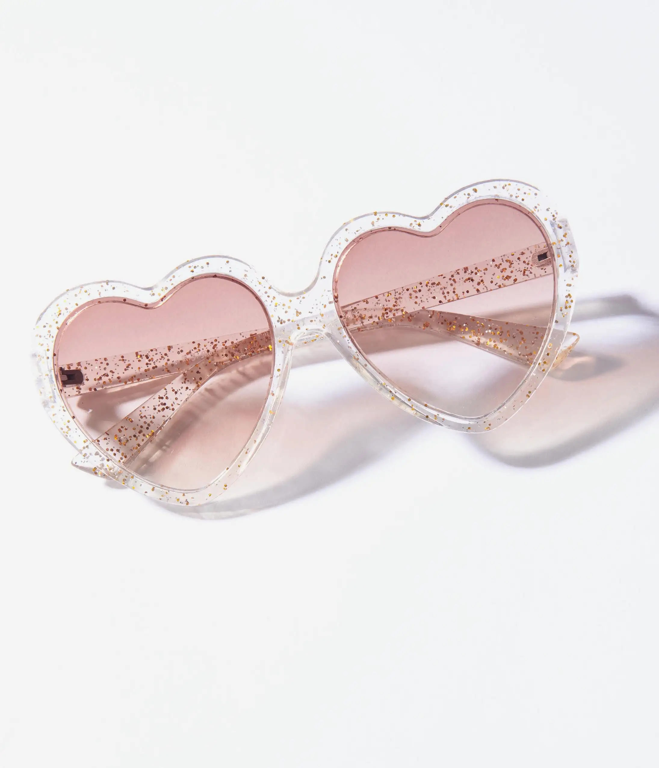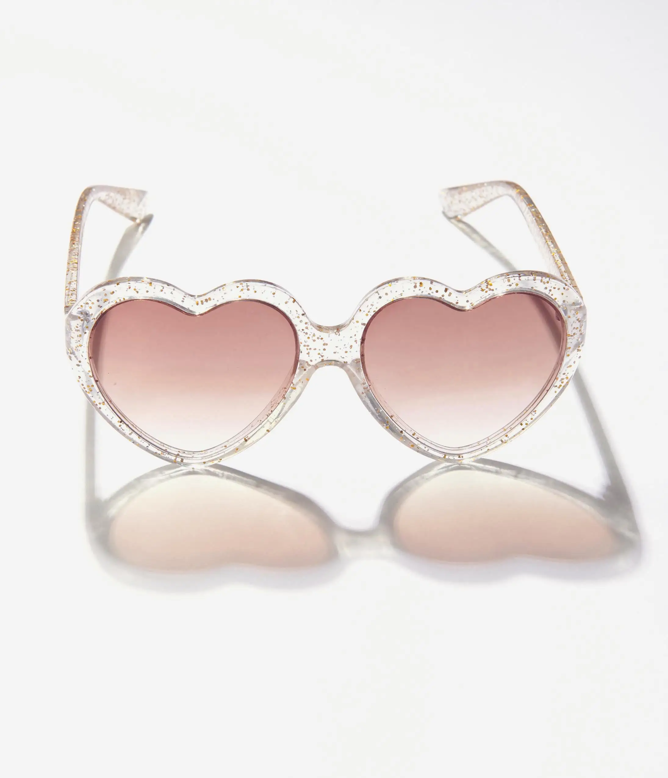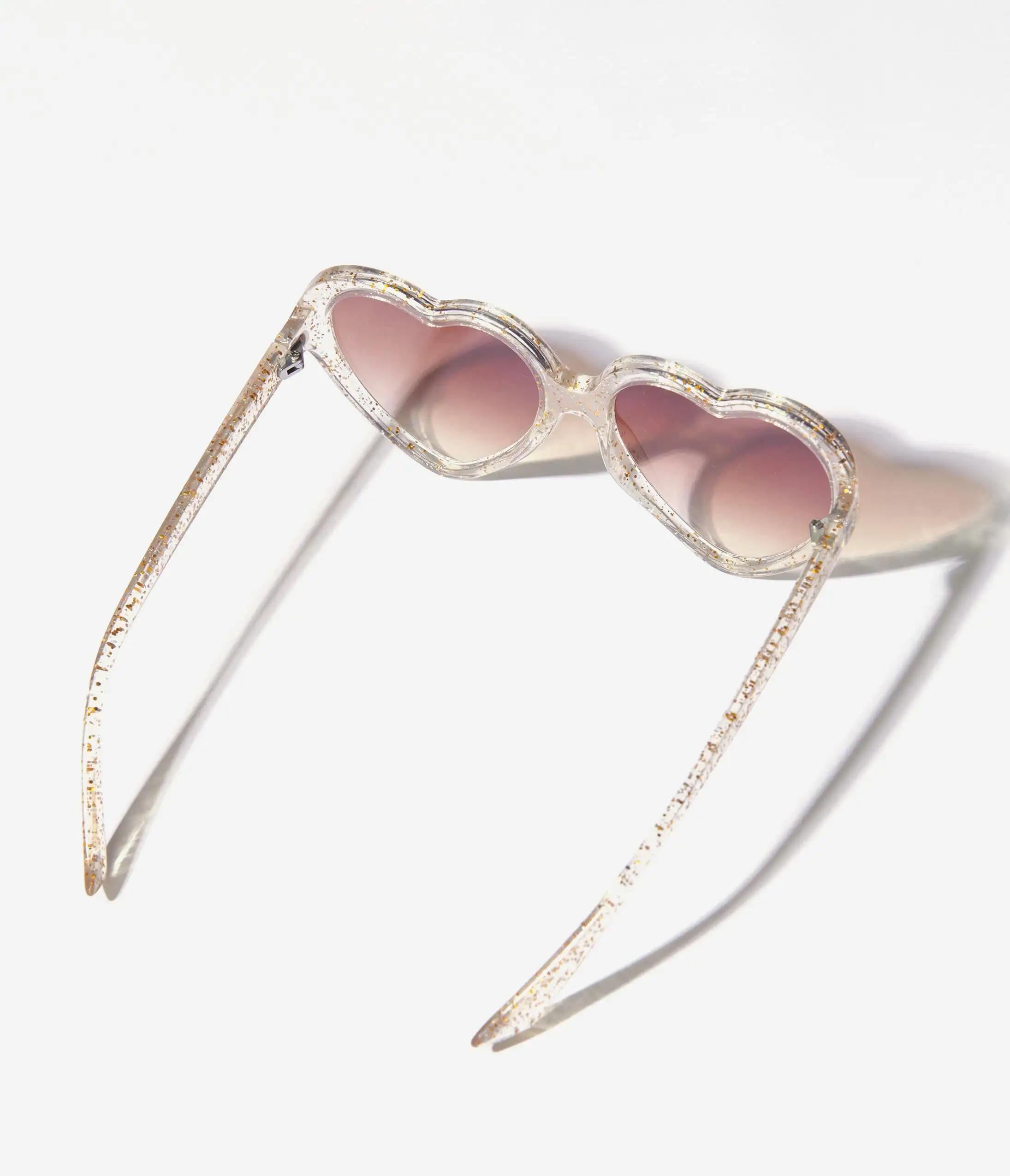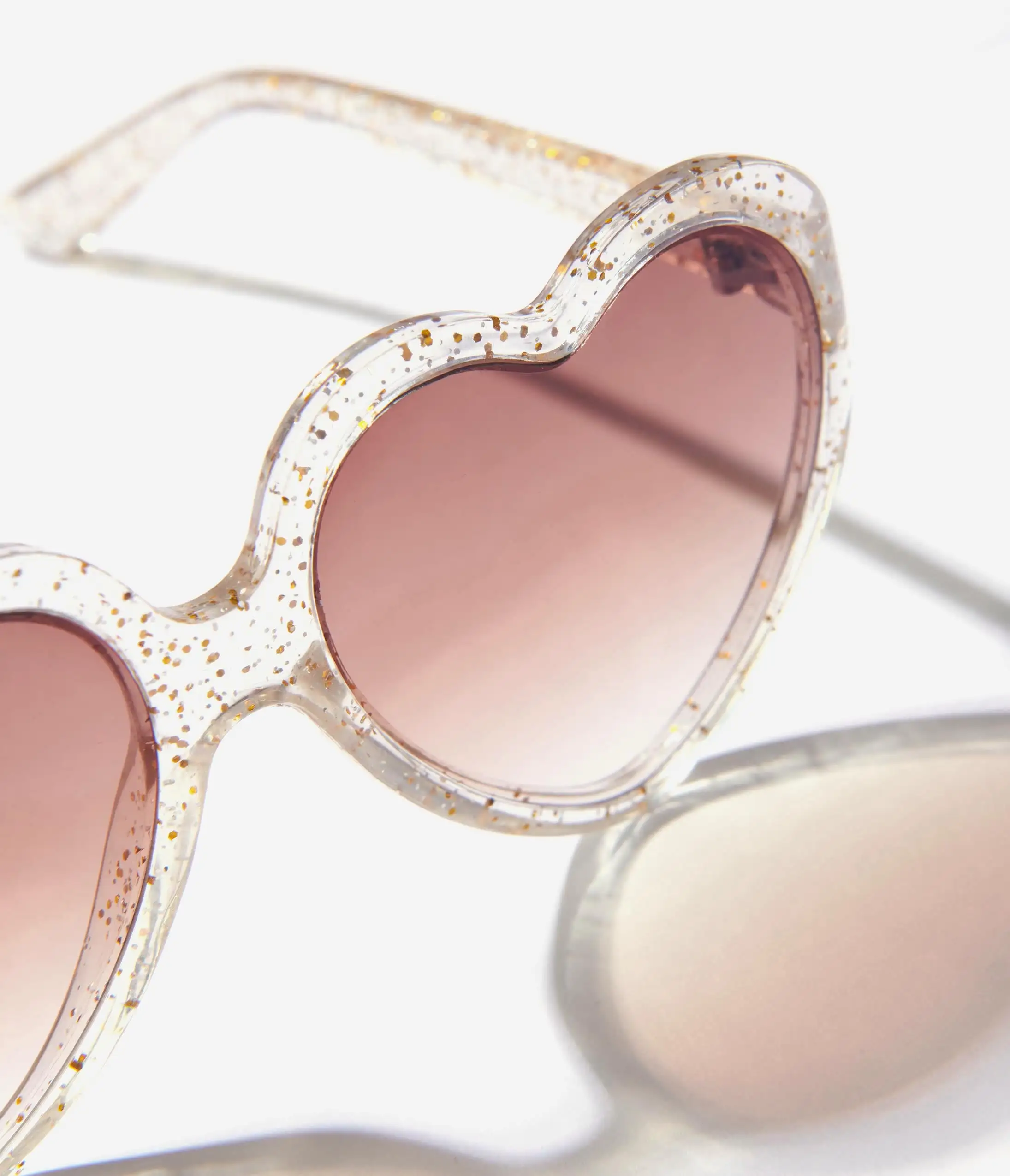 It’s love at first sight, darling! These stylish sunglasses are crafted in clear gold glitter heart shaped frames and boast tinted lenses for sunny protection. The tapered arms and molded nose keep these sunnies secure!