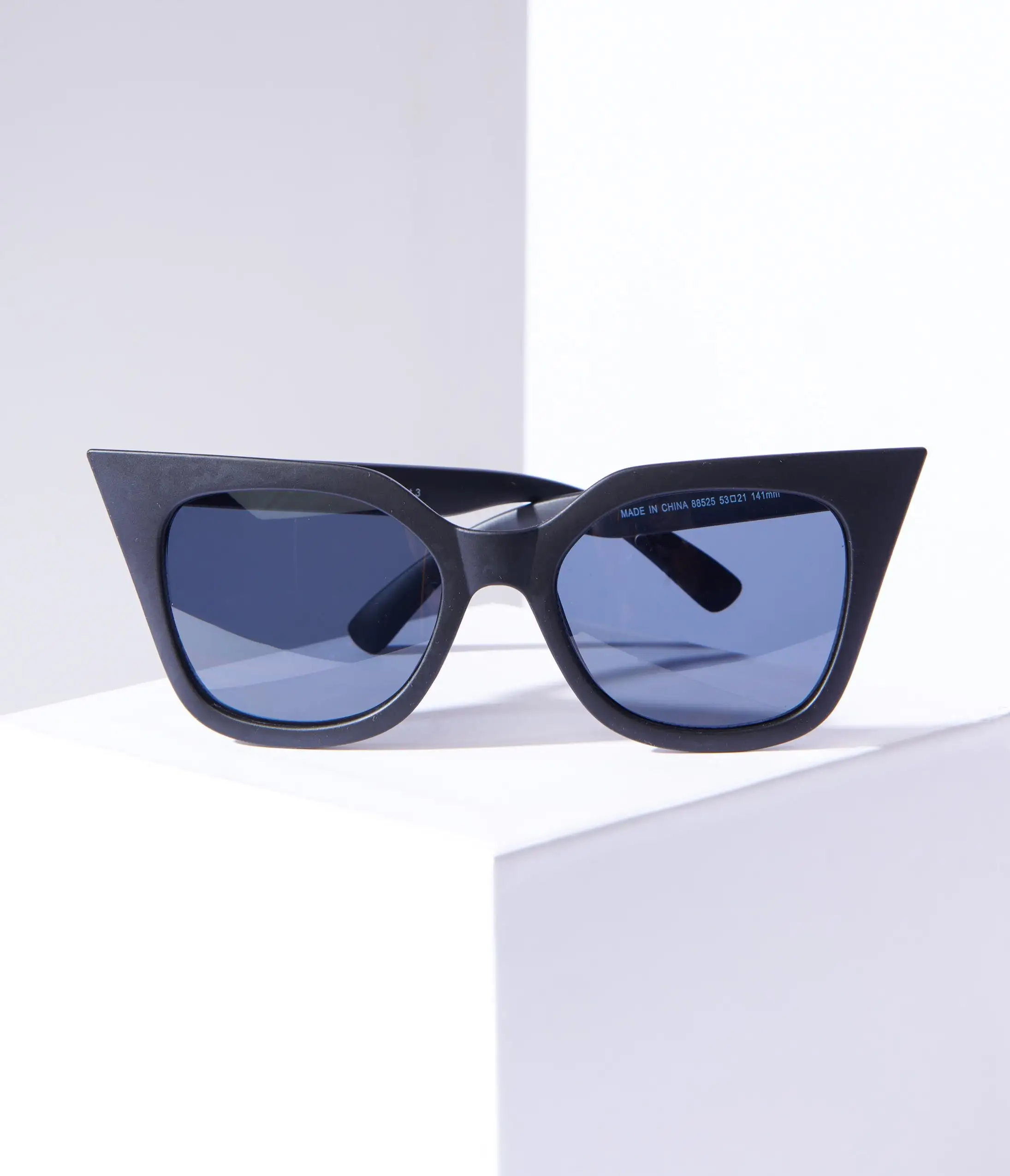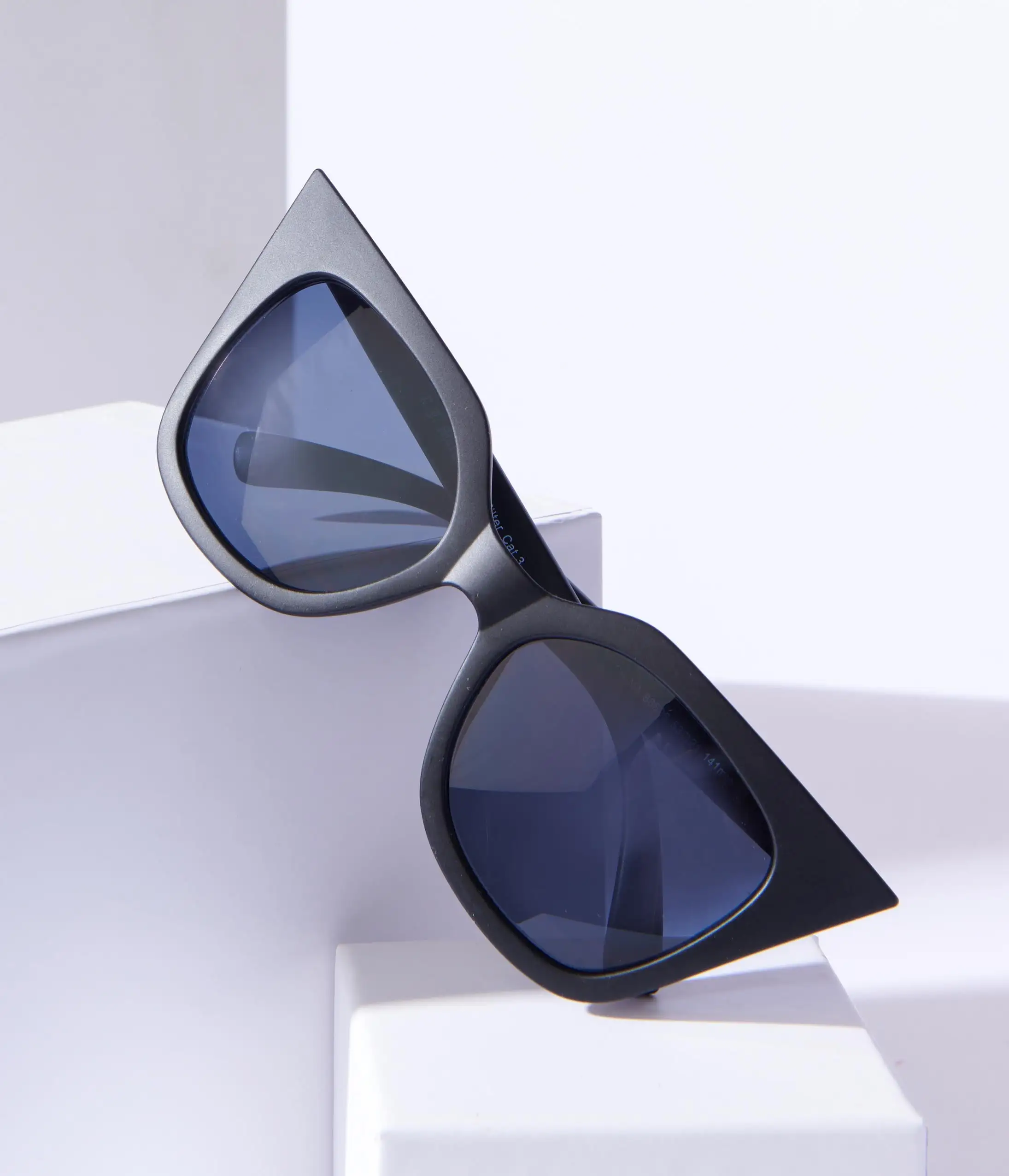 Matte black cat eye shaped sunglasses with tinted lenses. Complete with molded nose and curved arms.