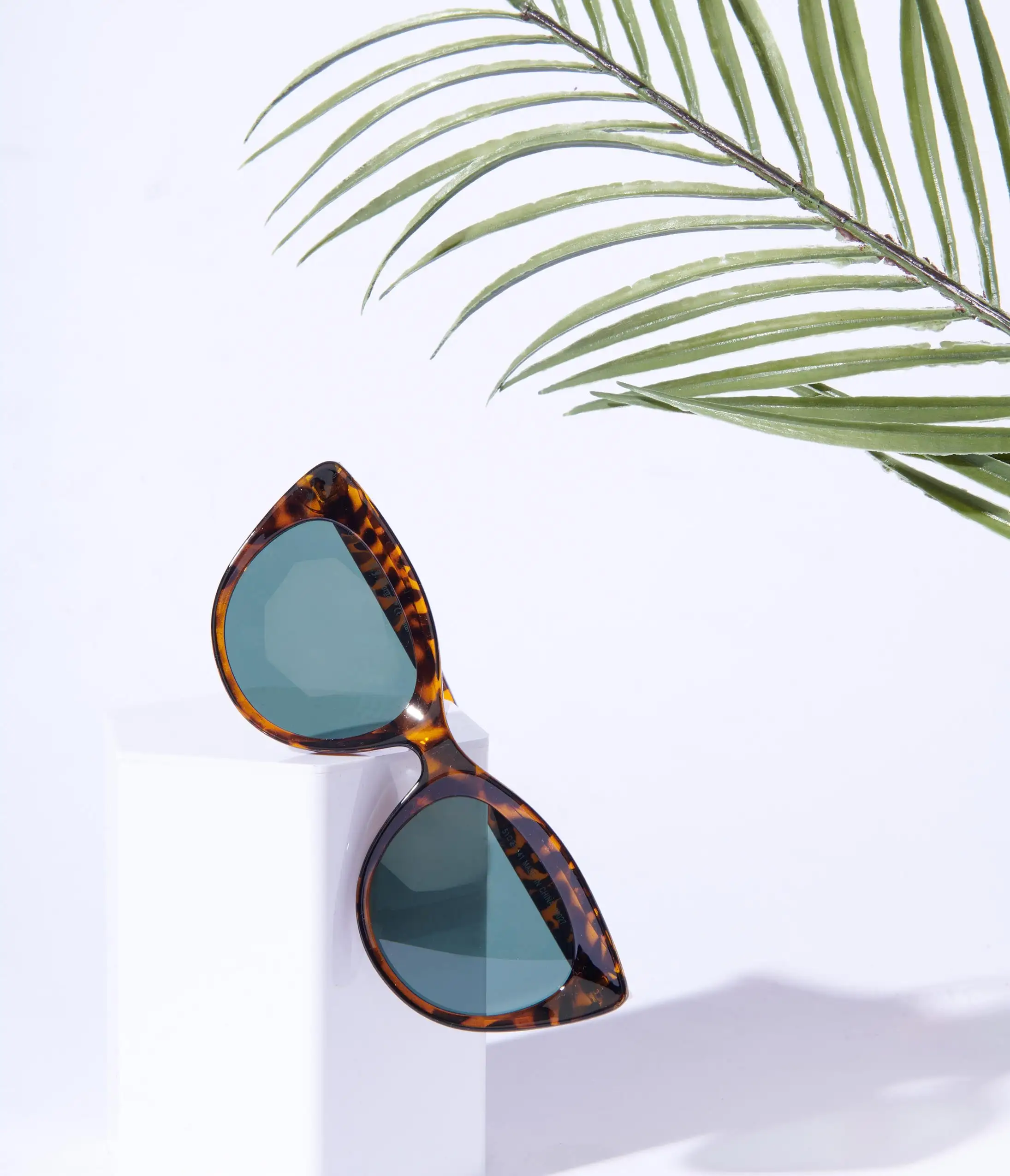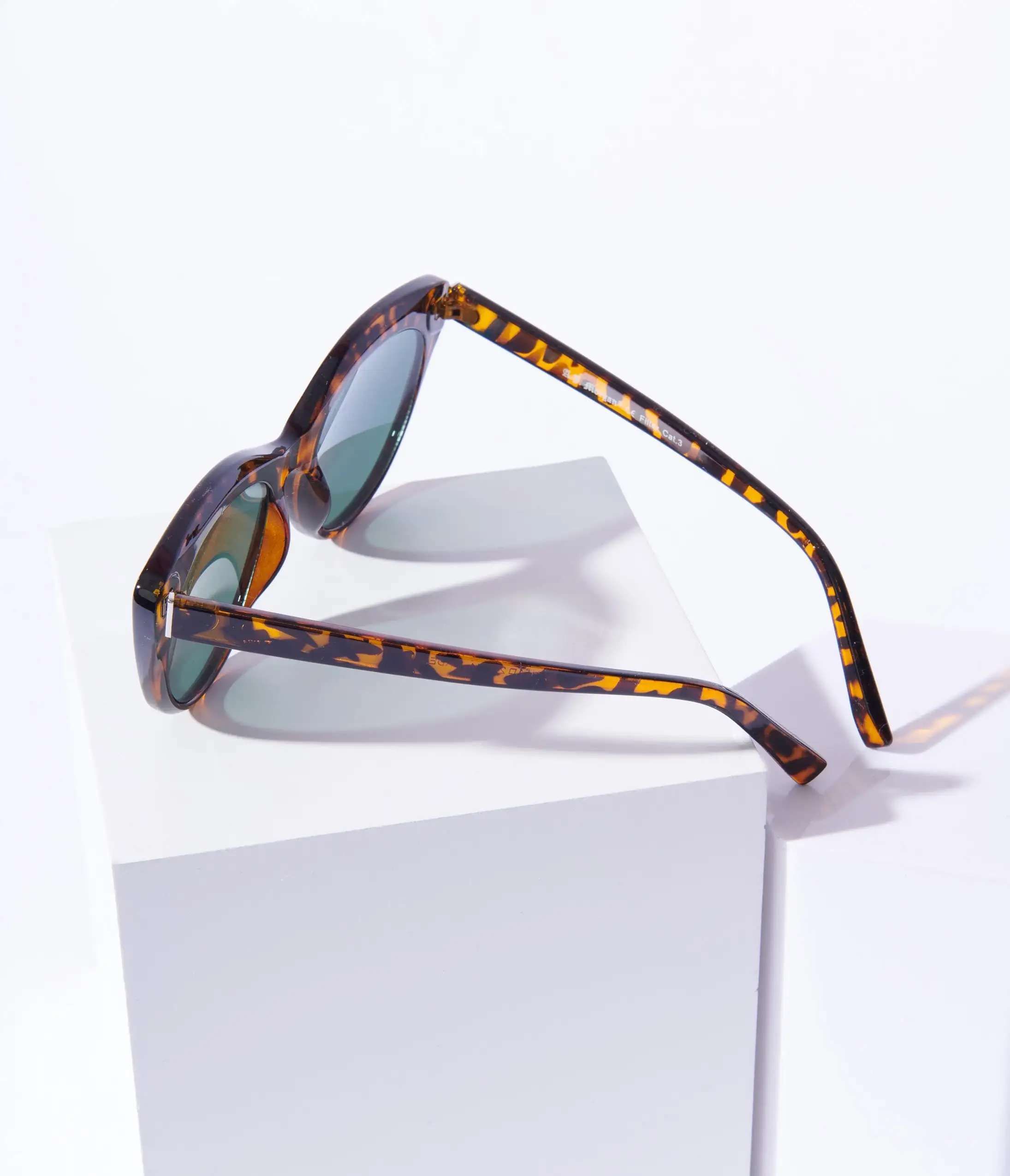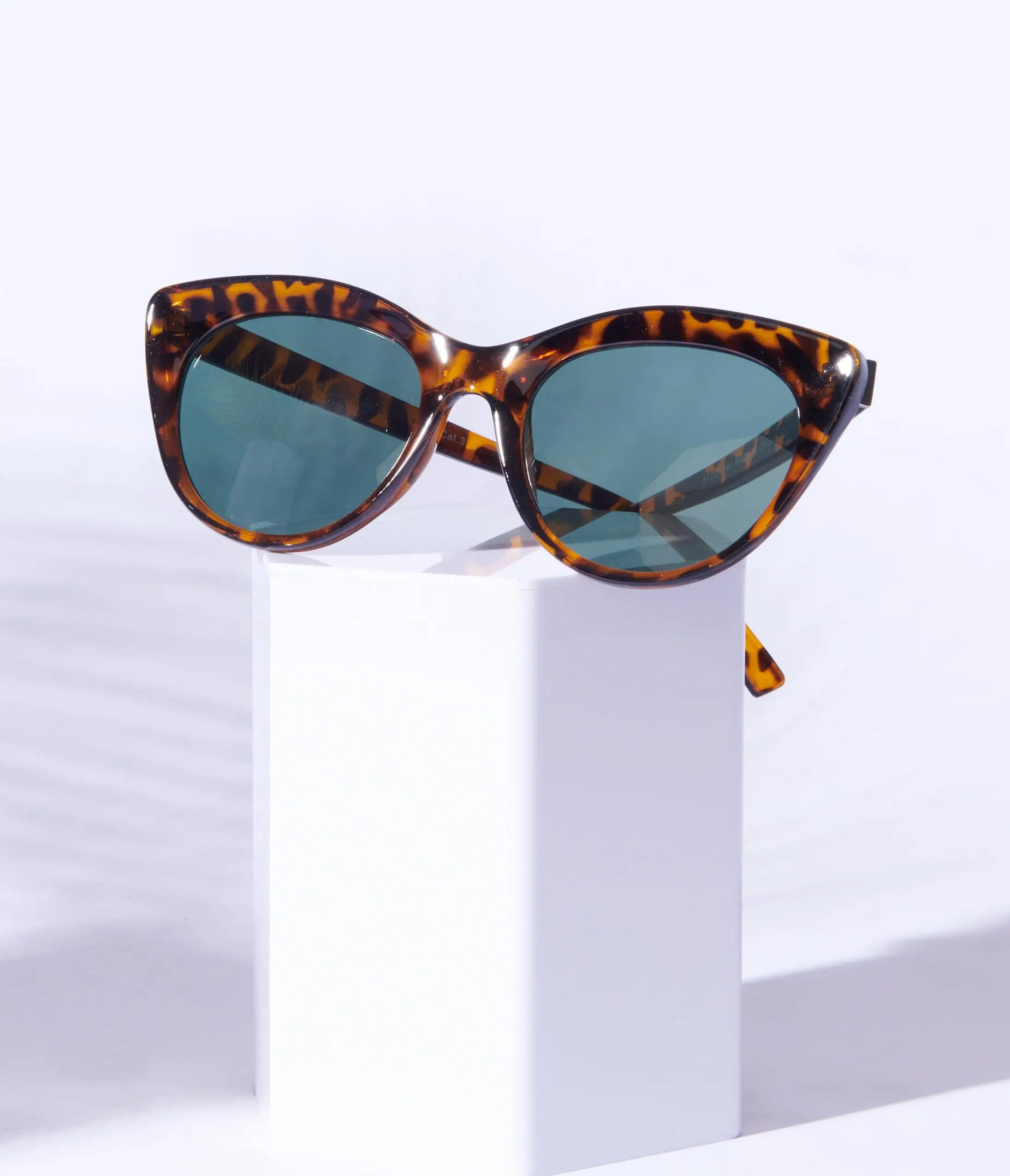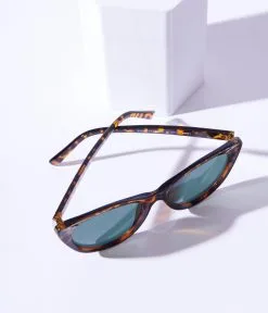 Brown and black tortoise cat eye shaped sunglasses with tinted lenses. Complete with molded nose and curved arms.
