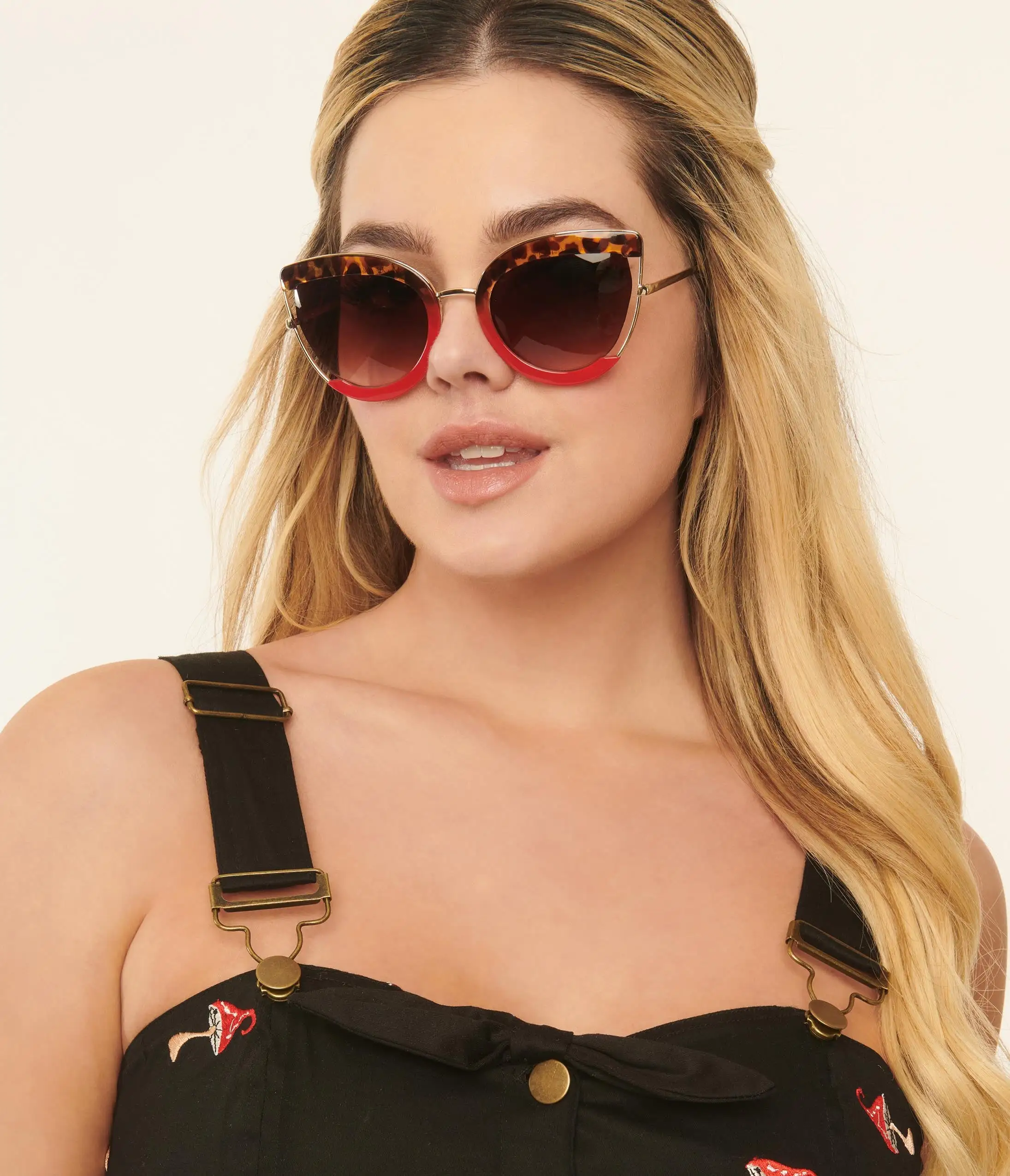 Styled in a vintage cat-eye design, these sunglasses with pseudo-floating tinted lenses set in red and tortoise shell polycarbonate frames and featuring steel hinges, curves arms, and molded nose.
