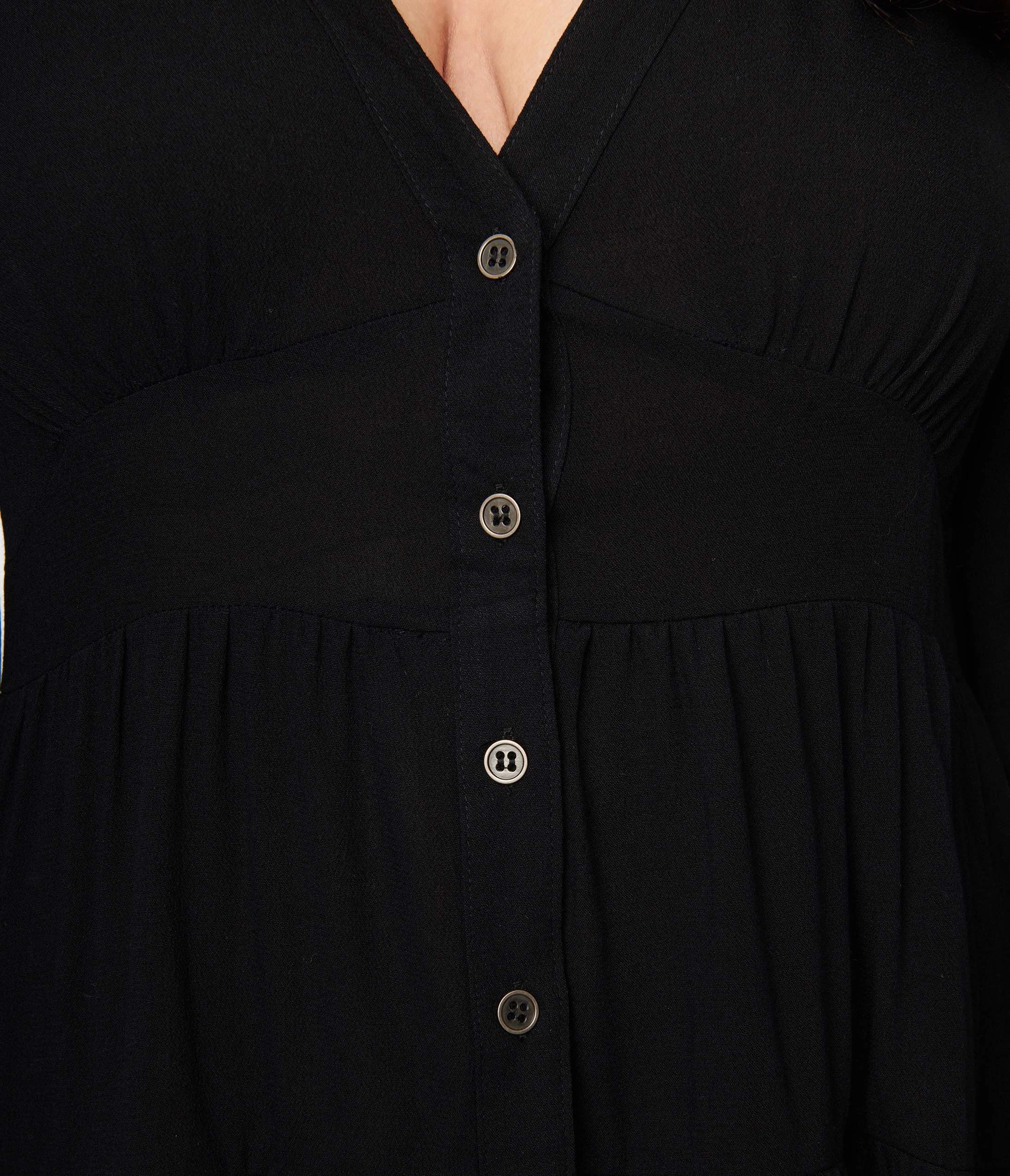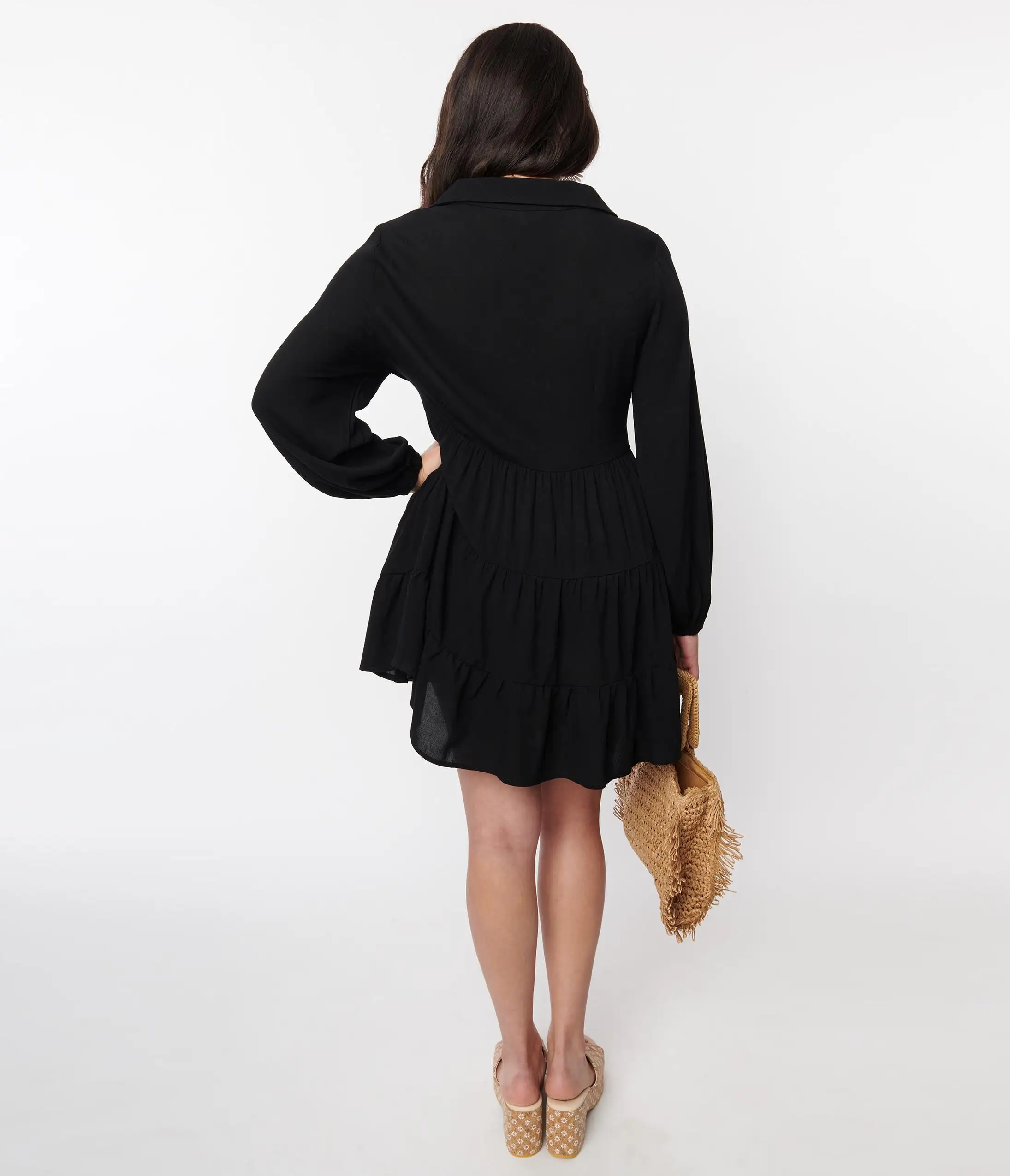 This tiered babydoll mini dress is the perfect blend of style and comfort! Featuring a tiered design that adds a touch of romance, while the long sleeves and collar give it a classic look. Made with a lightweight black woven, this dress is both durable and comfortable to wear. Complete with button down front.