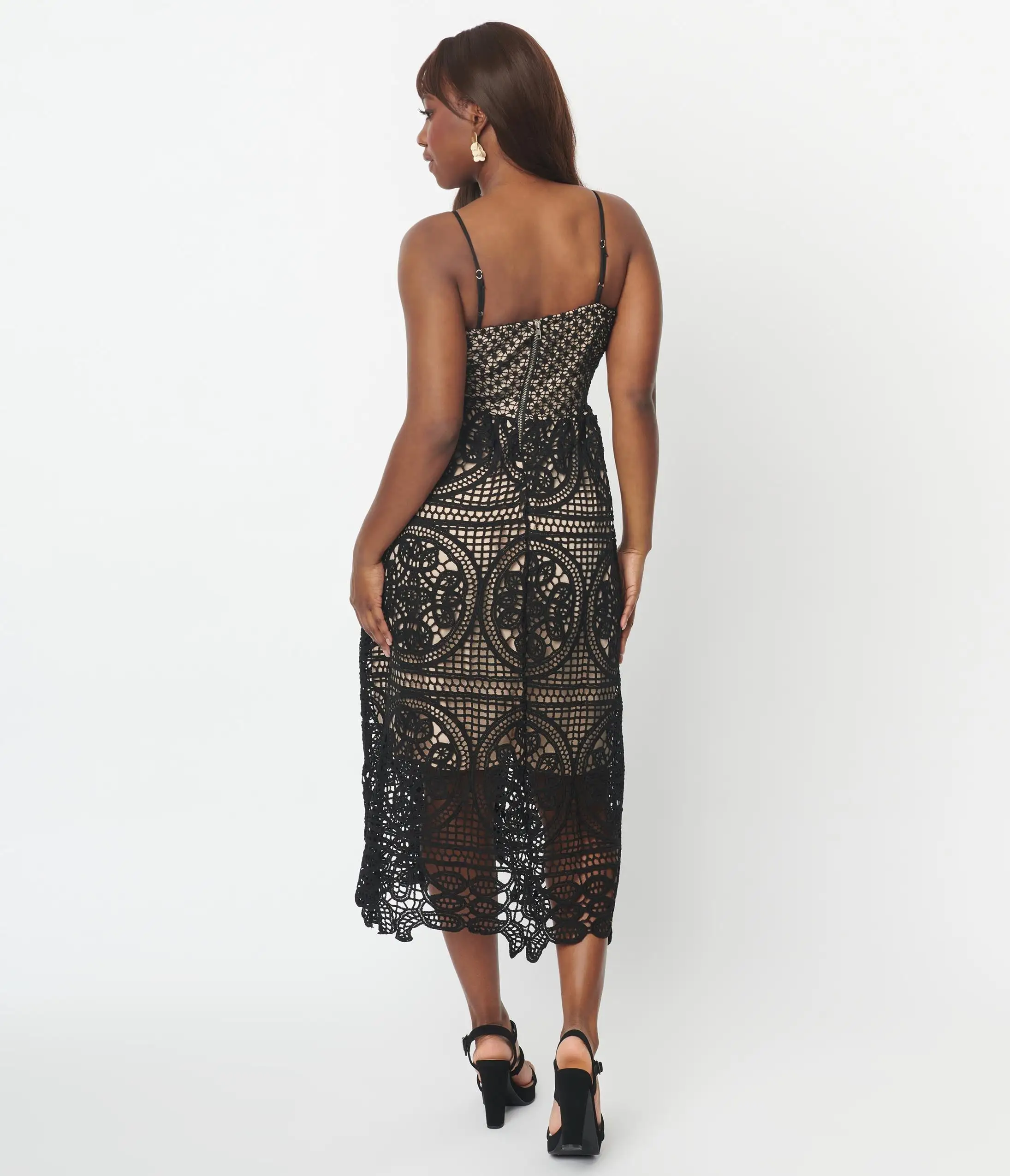 This stunning 1960’s inspired midi dress is crafted in a black knit fabric lace design that features a nude lining. The scoop neckline is anchored with adjustable spaghetti straps while the waist is nipped in with a back zipper.