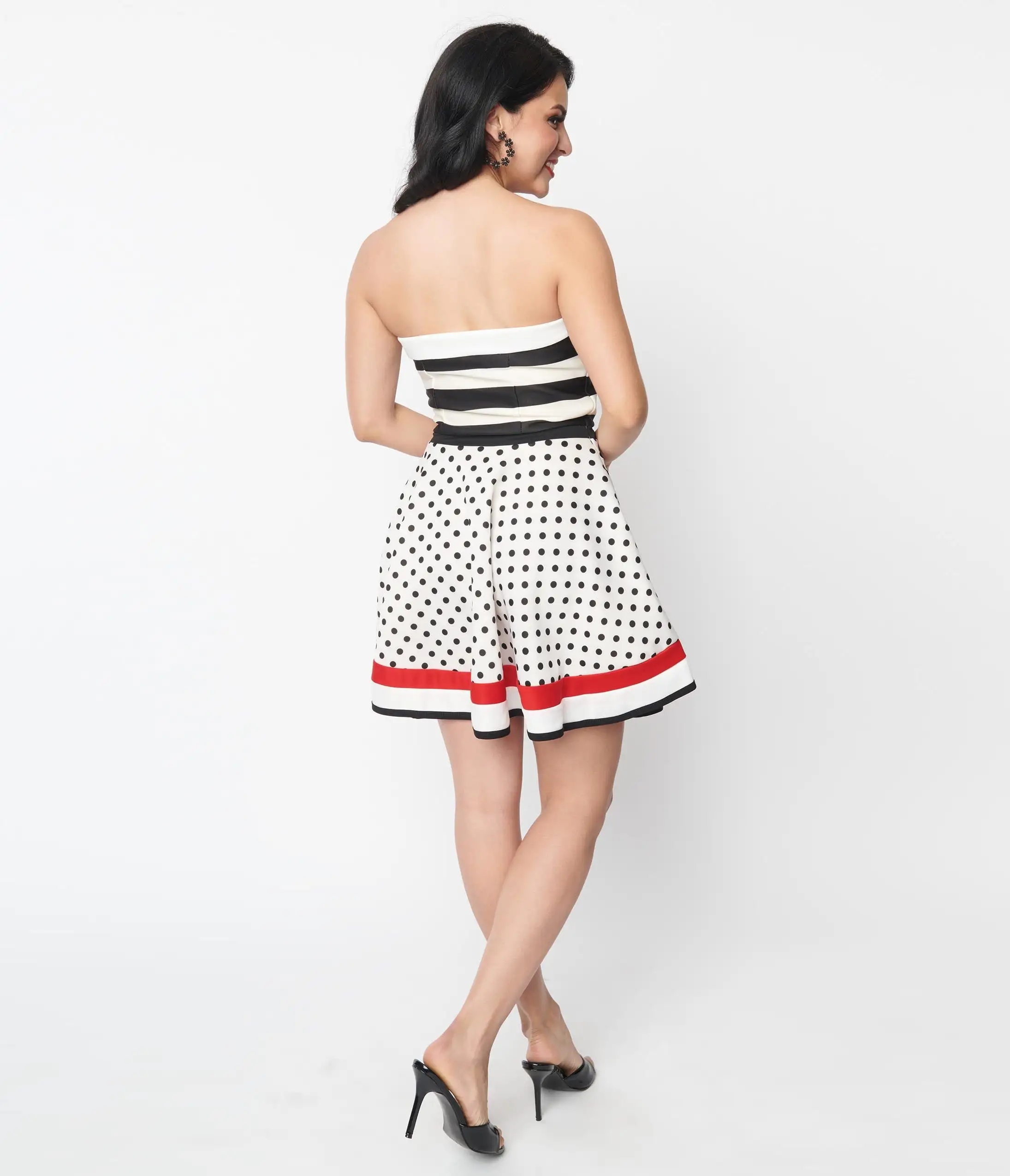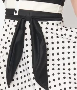 Step out into the scene with this 1950s style fit and flare dress crafted in a cream woven boasting a striped bodice and polka dot skirt with a red accent. Outfitted with a pleated sweetheart neckline, top boning, and an attached bow at the waist. Complete with a size zipper.