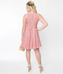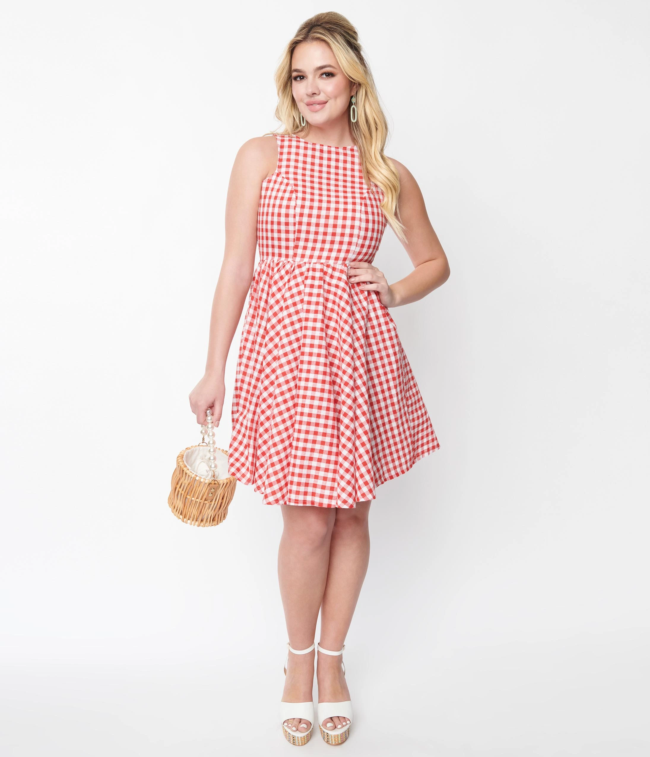 This sweet 1950’s style swing dress is crafted in a red and white gingham woven. The sleeveless silhouette features a swing skirt and back zipper.