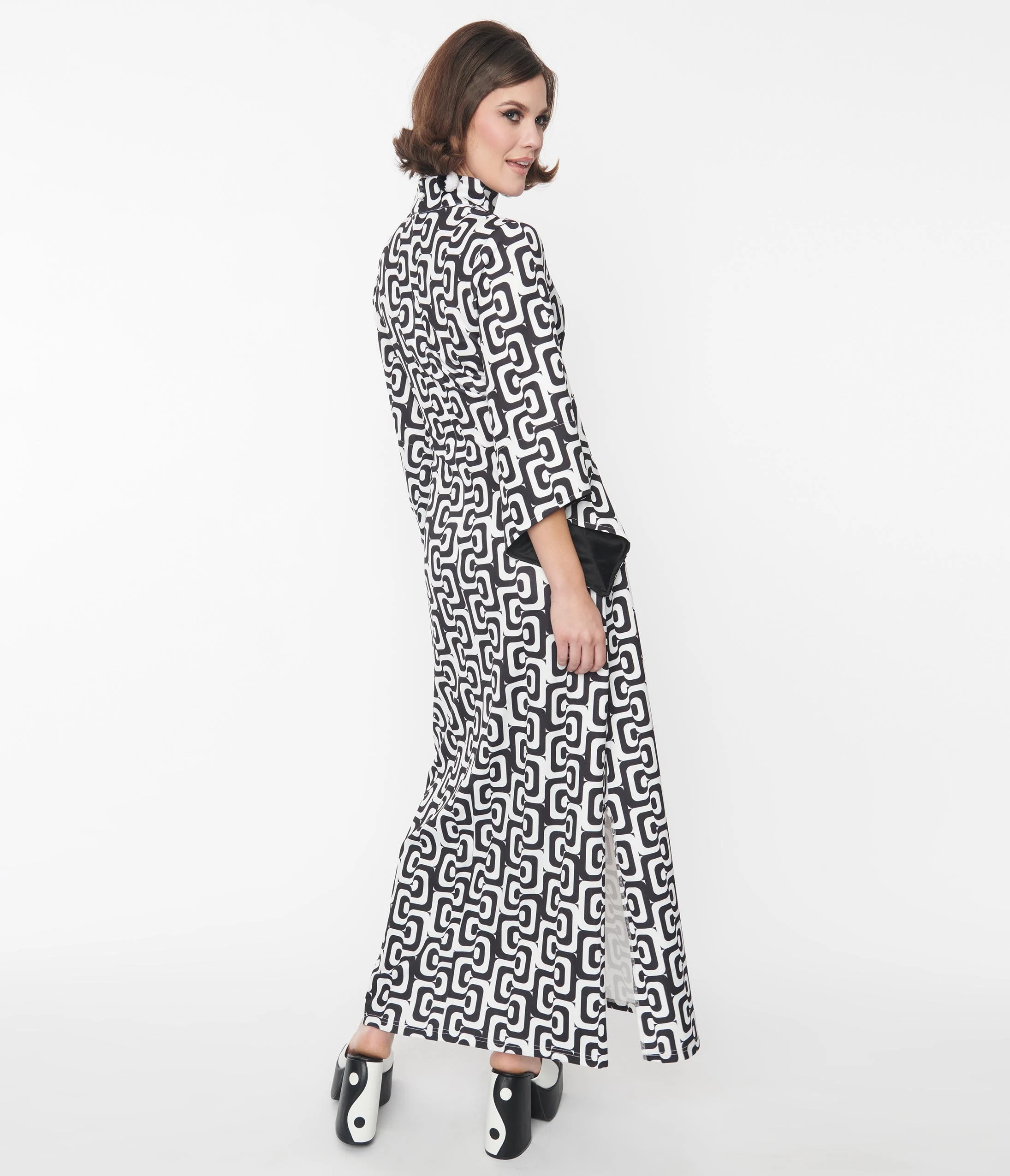 This groovy 1960s inspired maxi dress is crafted with a black and white mod style woven. Outfitted with a high collar and framed with quarter sleeves. Complete with a back zipper and a back collar button keyhole.