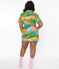 This fun 1960’s inspired plus size shirt dress is crafted in a woven fabric featuring psychedelic rainbow print throughout. Featuring a front zipper closure with a collared neckline anchored by short sleeves. Complete with front pockets and self-tie sash.