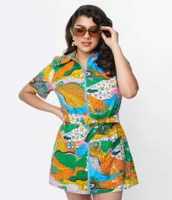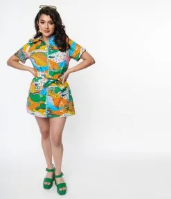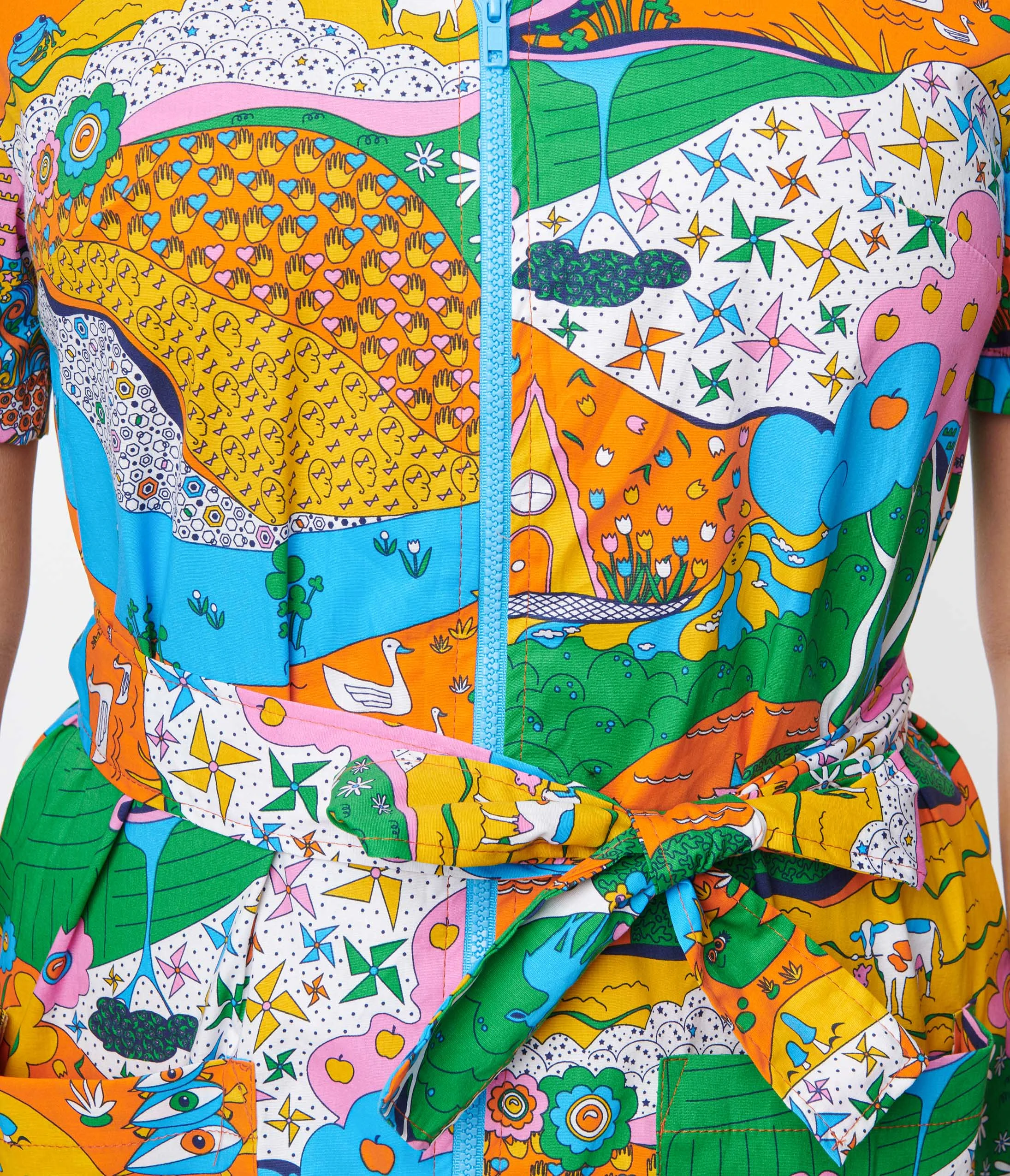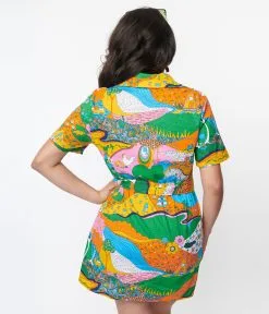 This fun 1960’s inspired shirt dress is crafted in a woven fabric featuring psychedelic rainbow print throughout. Featuring a front zipper closure with a collared neckline anchored by short sleeves. Complete with front pockets and self-tie sash.