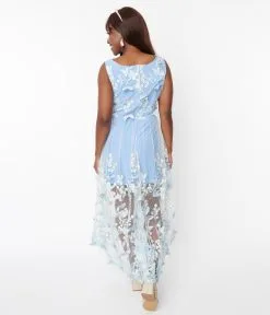 Be the epitome of ethereal grace in this stunning 1970s style light blue dress with an ivory maxi overlay. Delicately adorned with baby blue 3D butterflies over ivory florals, this dress is sure to take your breath away. The lightweight and flowy fabric will have you feeling effortlessly beautiful as you dance the night away.