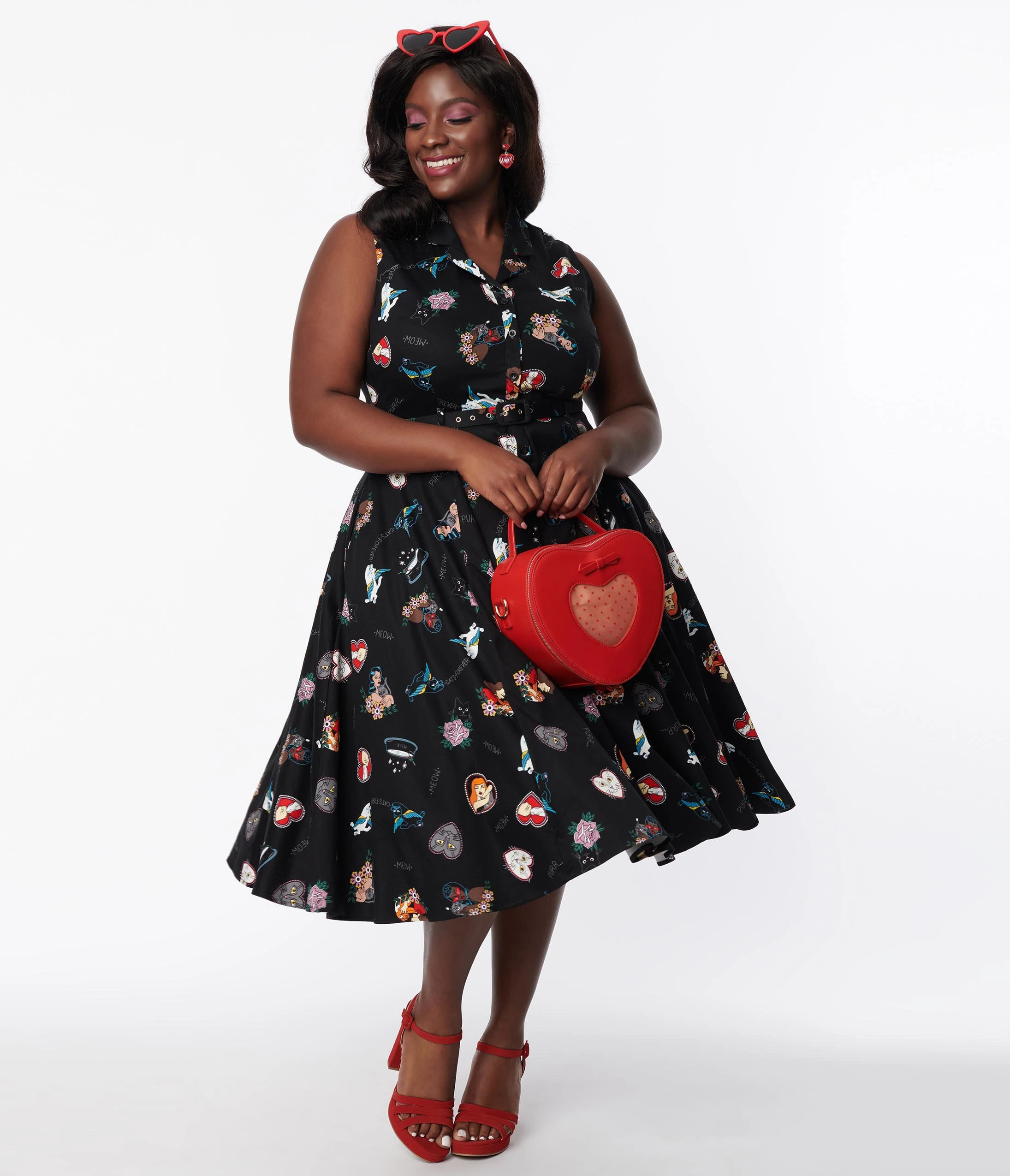 A cat lover’s dream! The plus size Caterina Dress from Collectif is a fabulous 1950’s style silhouette boasting beautiful traditional tattoo inspired cats print over a black backdrop. Crafted in a soft woven fabric, the button up bodice leads to a delightful notched lapel that frames a modest V-neckline. The darted bodice tops a seamed waistline while a matching buckle belt nips in your hourglass as the dramatic swing skirt cascades past the knees. Outfitted with hidden side pockets, Caterina is set to impress!