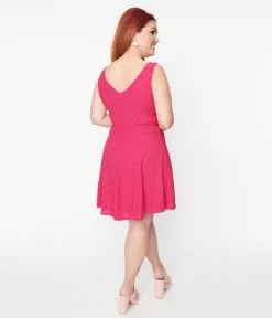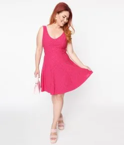This flirty plus size fit and flare dress is crafted a bright fuchsia and features an eyelet design throughout. The sleeveless design allows for a comfortable fit, while the fit and flare silhouette accentuates the waist and creates a flattering look.