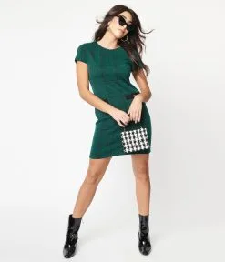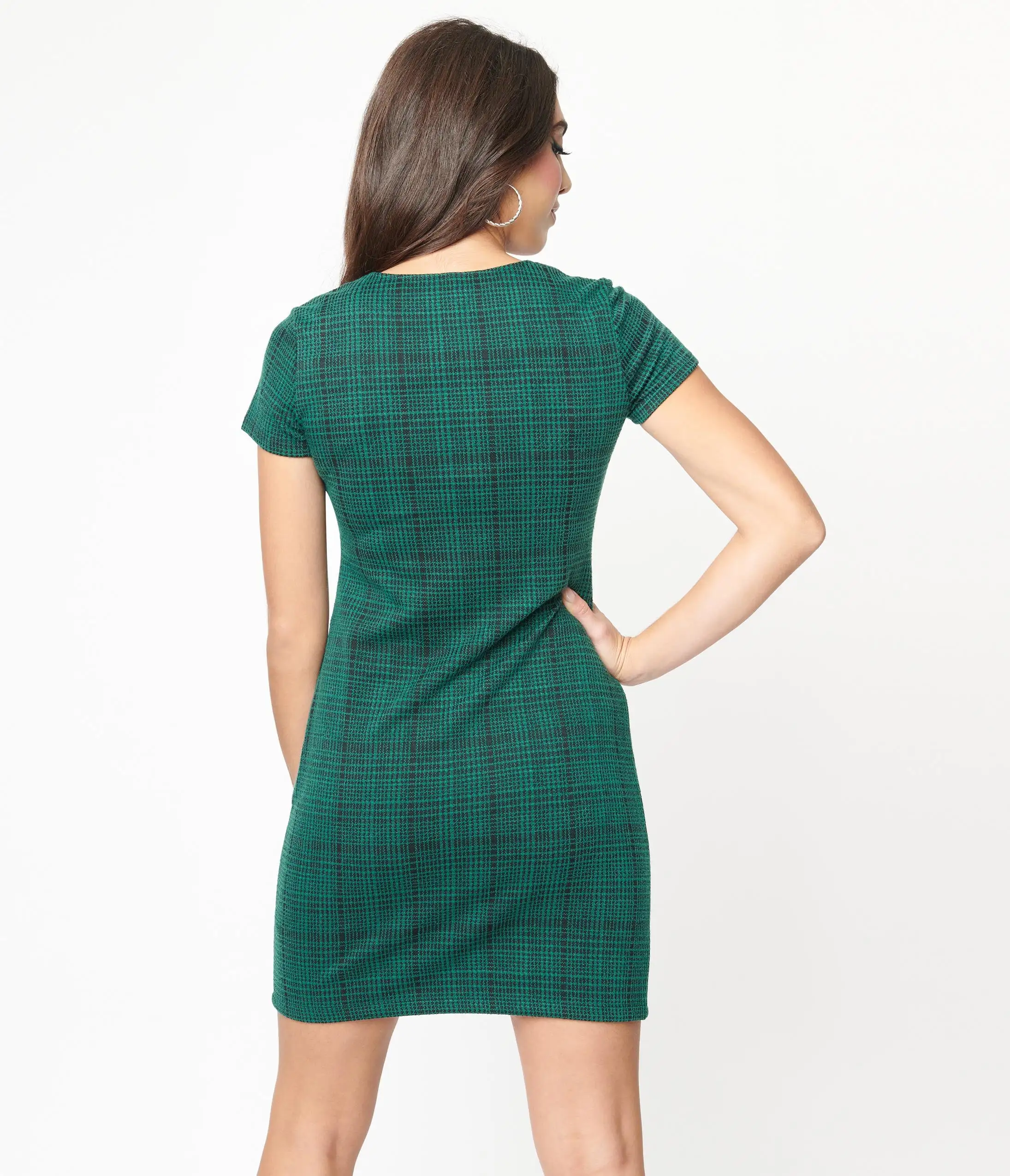 A retro standout, dolls! This edgy shift dress is crafted in a flattering emerald green and black plaid knit with a dash of stretch. The modest scoop neckline is framed by short sleeves while the darted bodice and tapered waist lend a flattering fit to your feminine form. The A-line skirt is embellished with faux front pockets and accented with large silver faux buttons. Complete in a pull on design that drops to a straight hem above the knees!