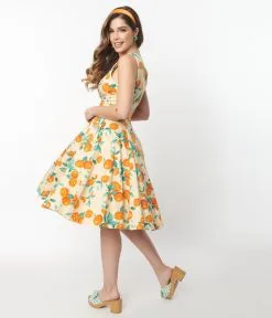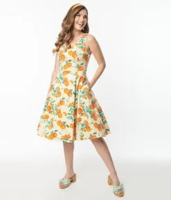 This fabulous fit and flare dress is crafted in a pale orange woven and features oranges printed throughout. With a ravishing sleeveless design, the darted bodice features an iconic V-neckline for flirtatious form while the seamed waist centers your hourglass shape. The skirt cascades beautifully around your curves to a straight hem at your knees while side pockets keep your essentials close at hand. Outfitted with a back zipper to nip in your figure, it’s a darling essential for vintage divas!