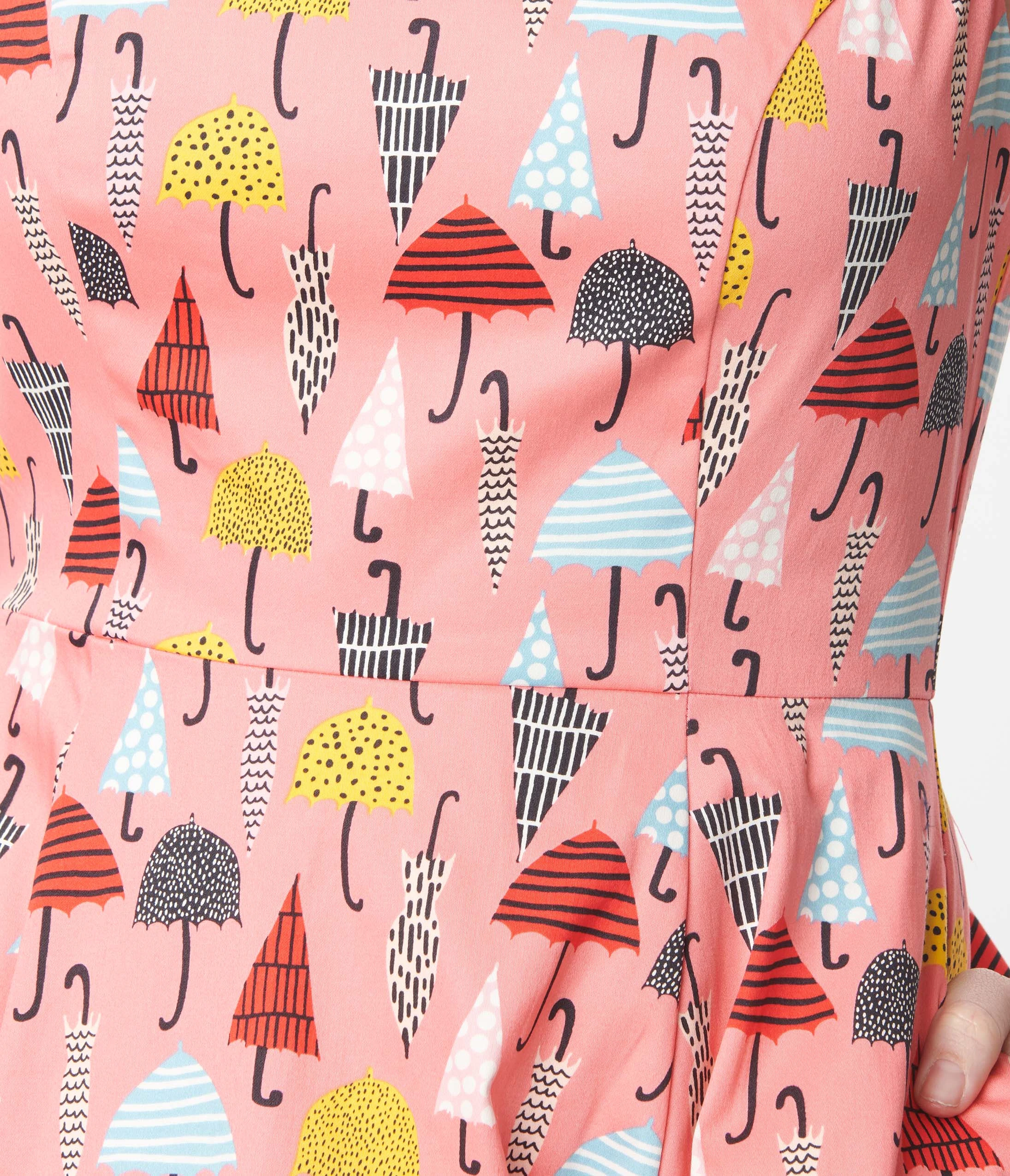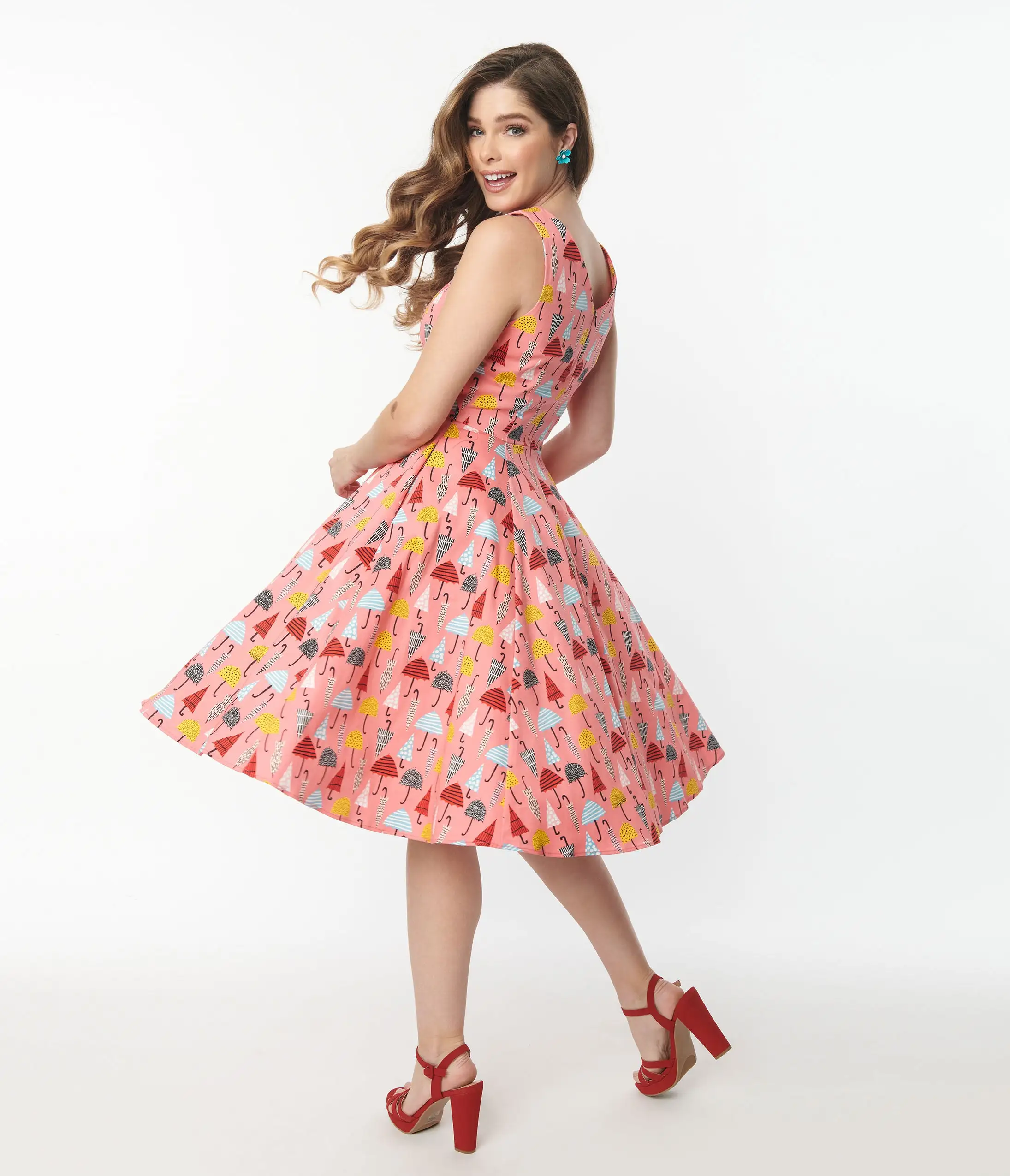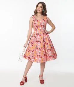 This fabulous fit and flare dress is crafted in a pink woven and features multicolored umbrellas printed throughout. With a ravishing sleeveless design, the darted bodice features an iconic V-neckline for flirtatious form while the seamed waist centers your hourglass shape. The skirt cascades beautifully around your curves to a straight hem at your knees while side pockets keep your essentials close at hand. Outfitted with a back zipper to nip in your figure, it’s a darling essential for vintage divas!
