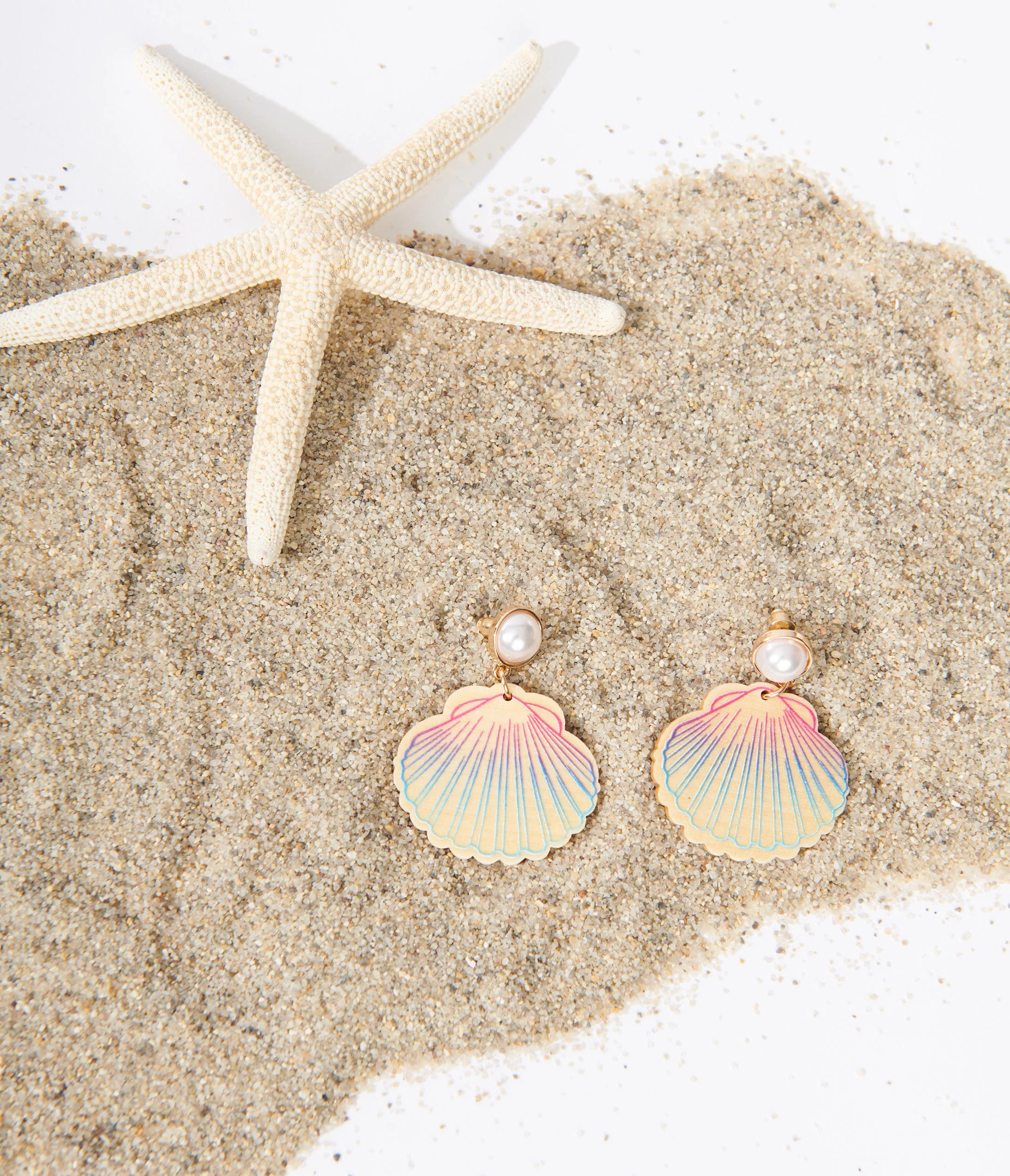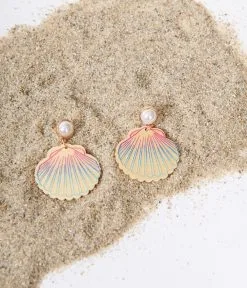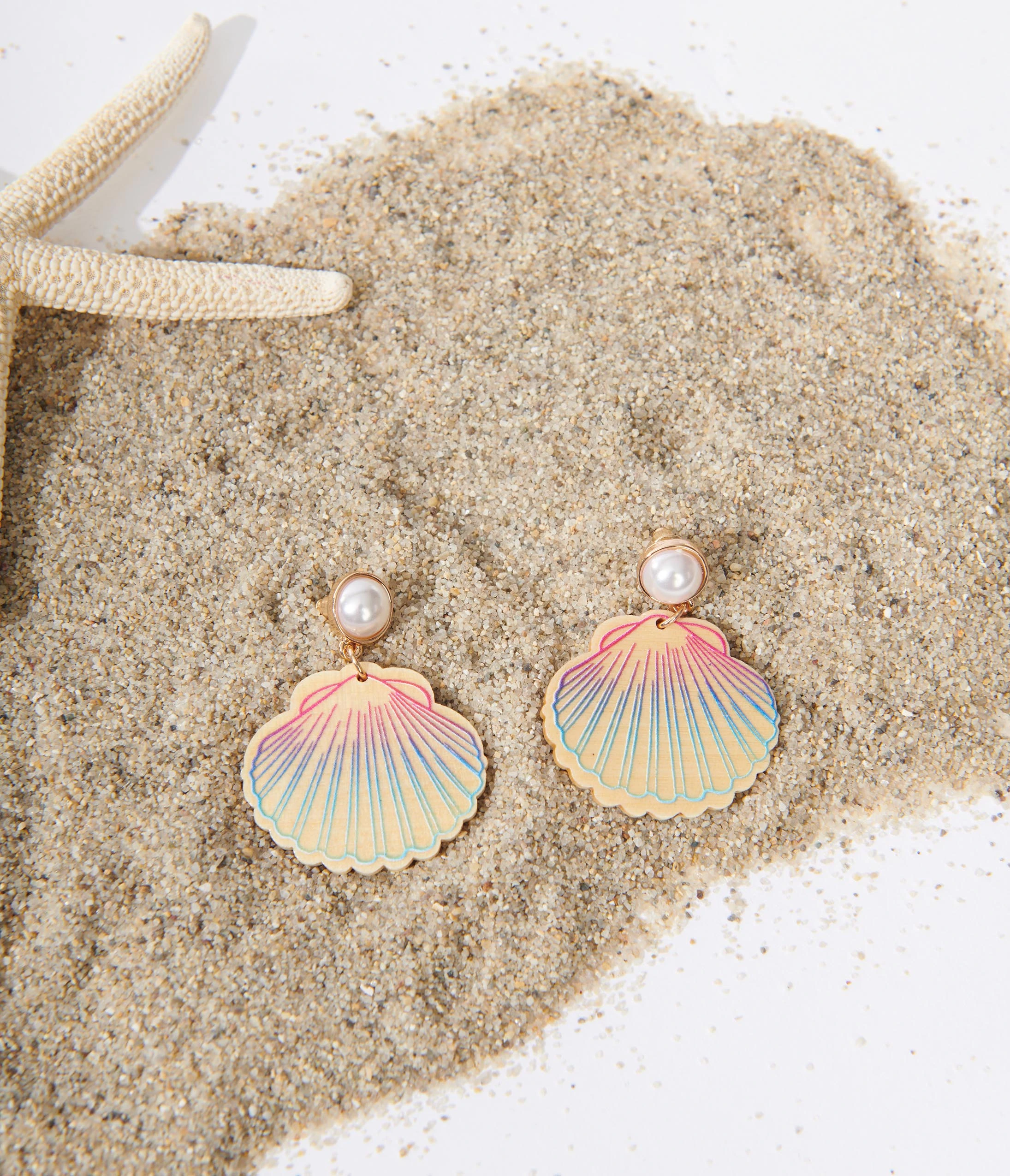 These adorable earrings feature a blue and pink ombre painted wooden seashell dropping from a faux pearl with a post back.