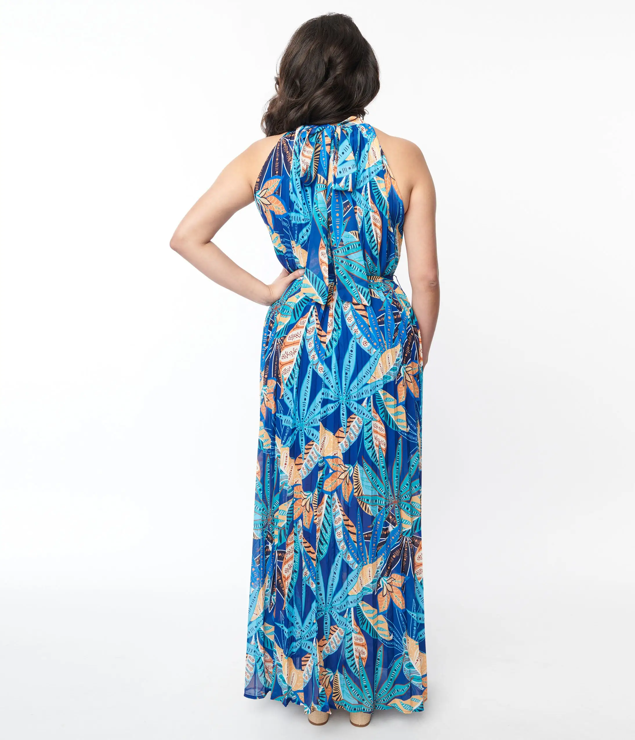Stay vacation ready with this 1970s style maxi dress is set in a blue woven boasting tropical prints throughout. Outfitted with a self-tie halter neckline and pleated details. Complete with a matching sash.