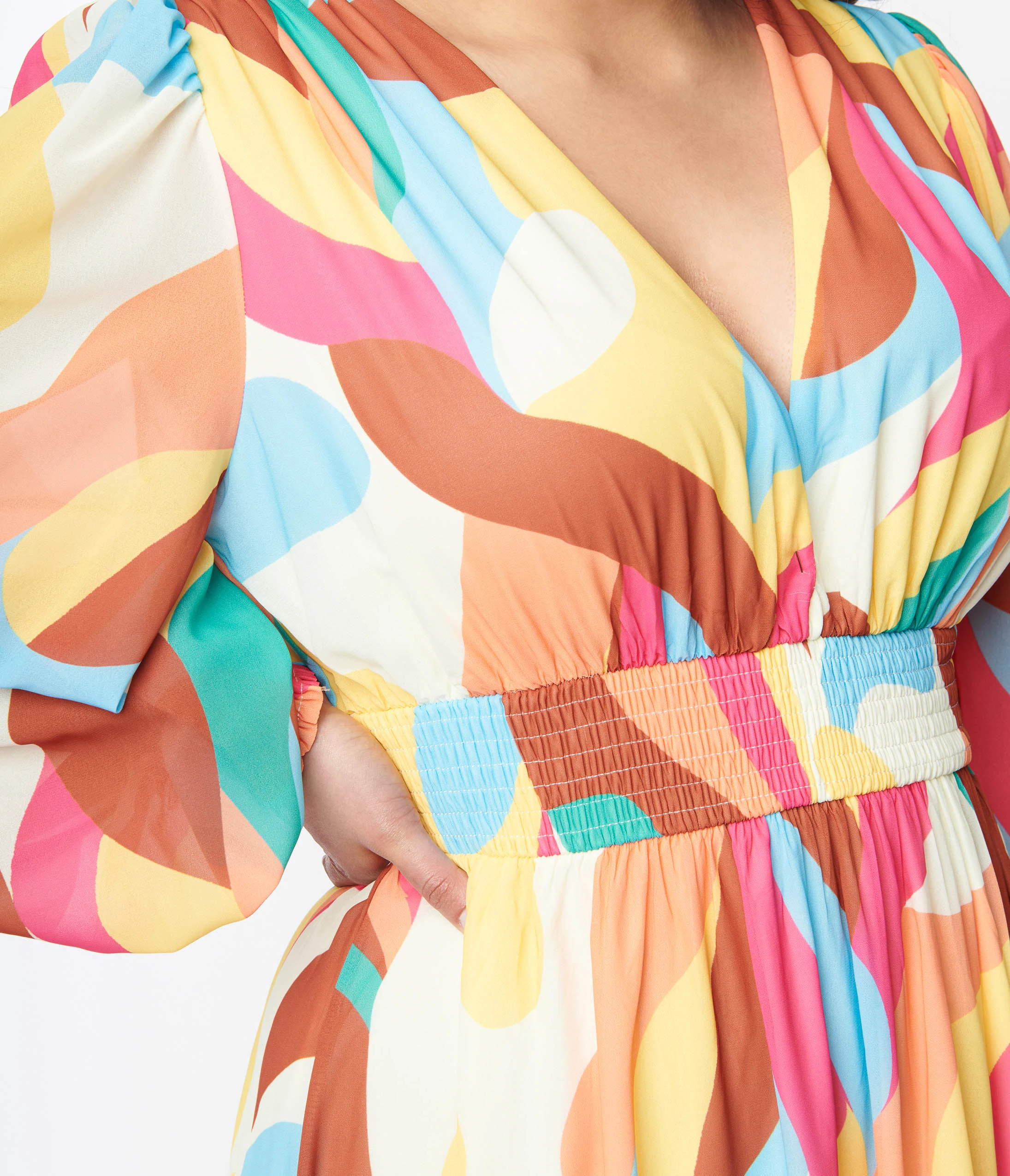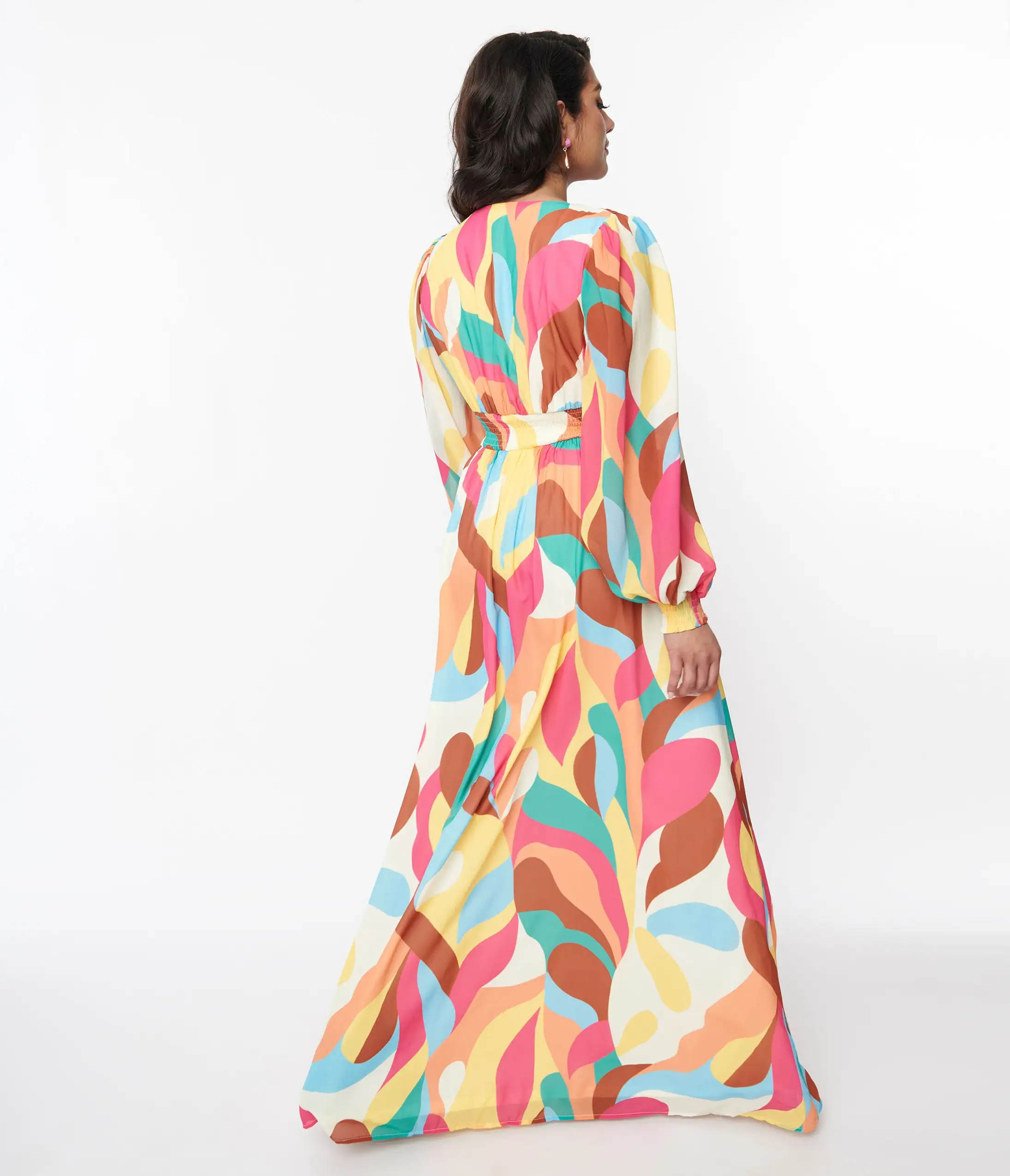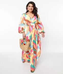 A walking work of art, this 1970s style maxi dress is set in a cream lightweight woven boasting multicolor abstract strokes throughout. Outfitted with a plunging V neckline and long sleeves. Complete with an elastic waist and cuffs.