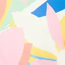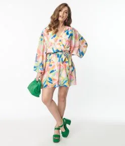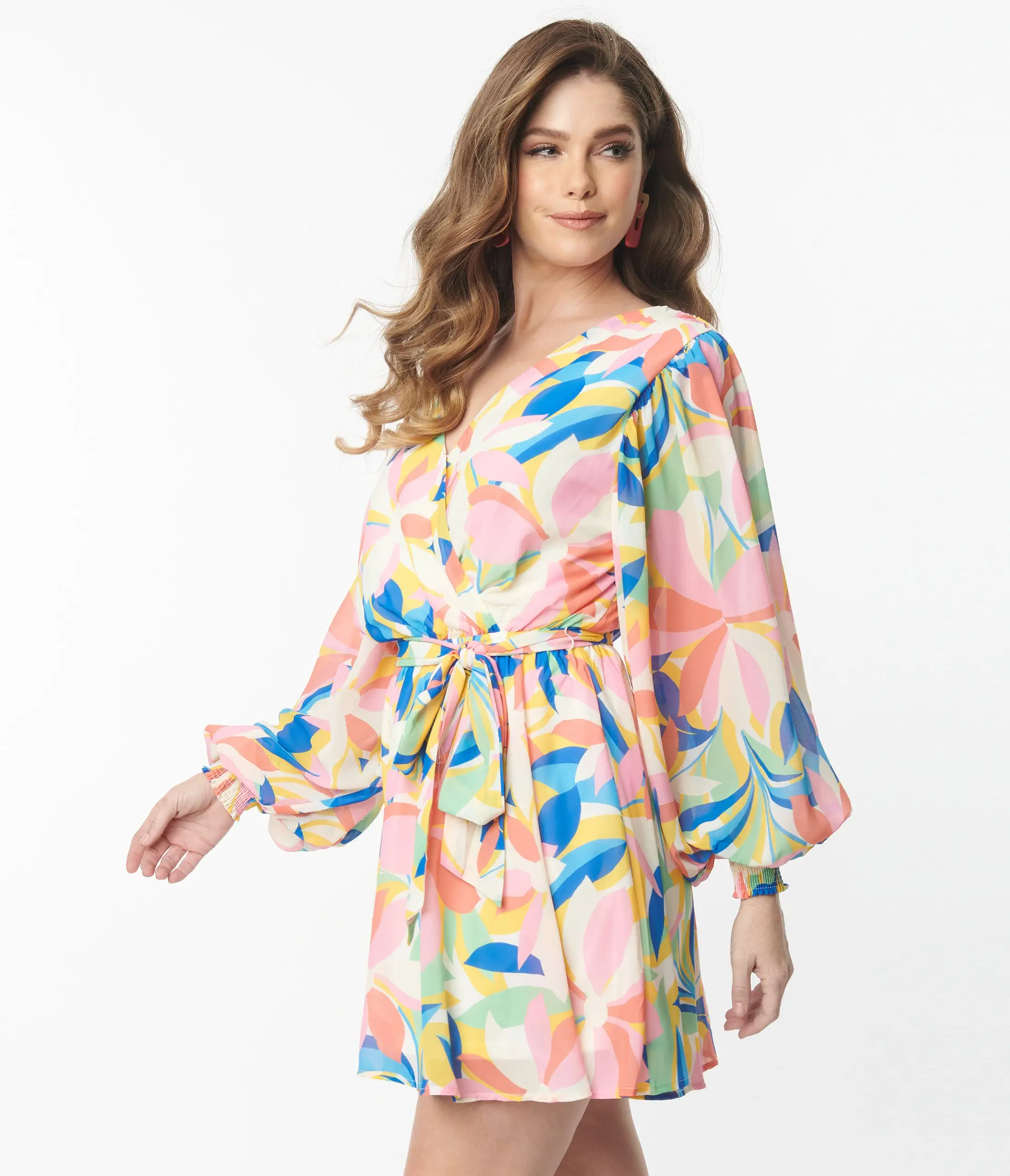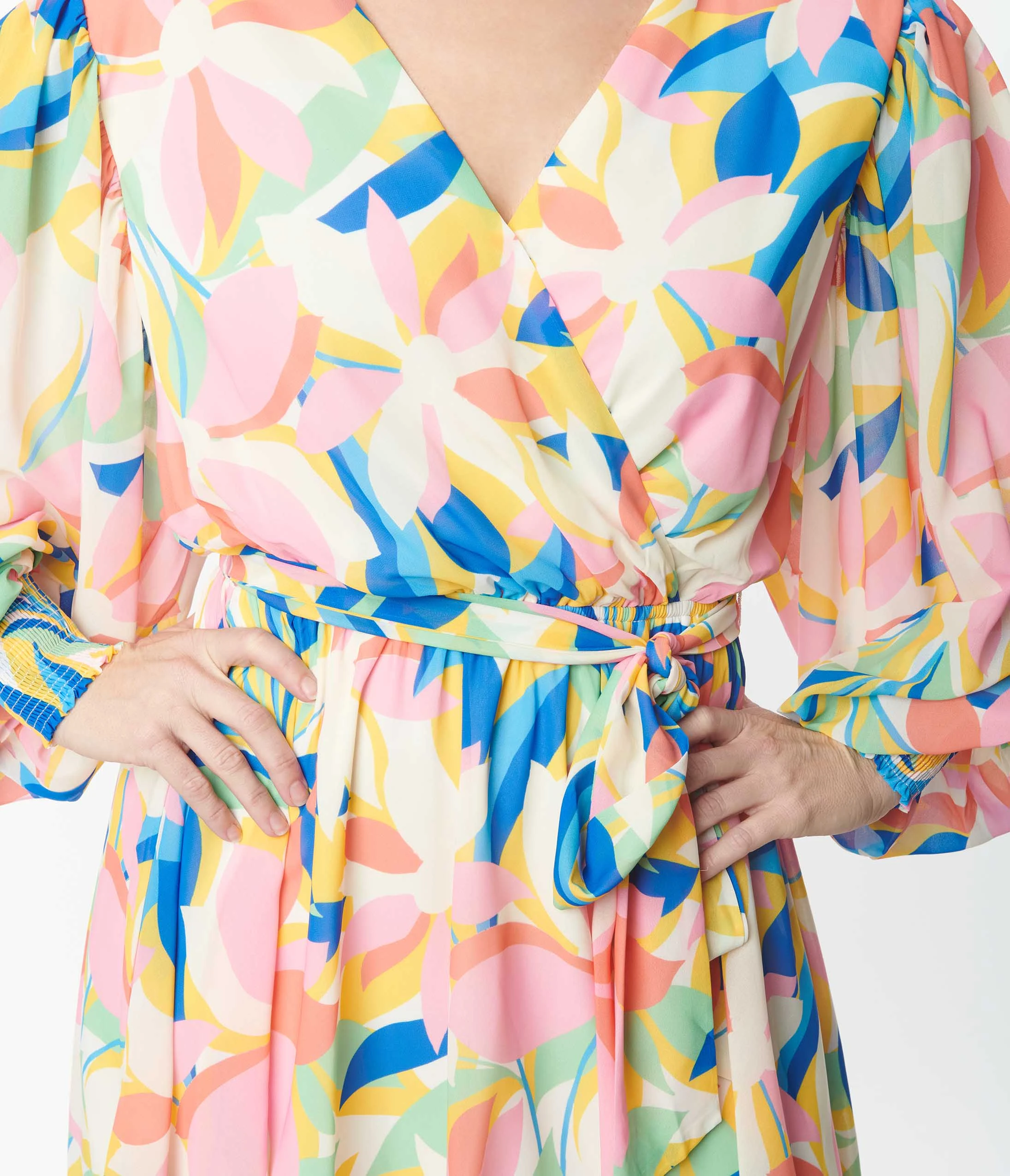 This playful 1970s style wrap dress is crafted in a lightweight knit boasting pink florals and green and blue leaves over a yellow backdrop. Complete with a sash and snap button for the long sleeve framed surplice neckline.