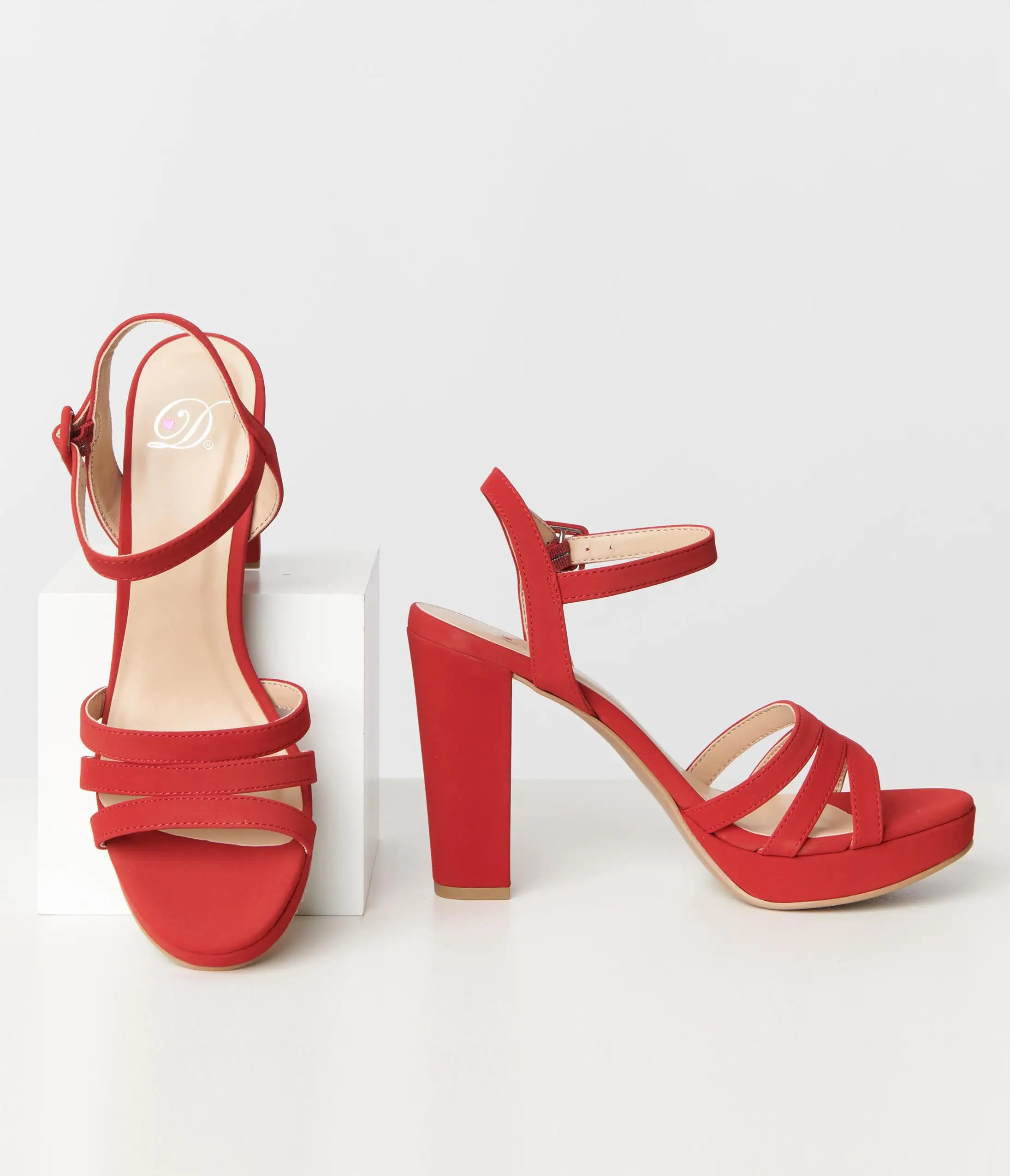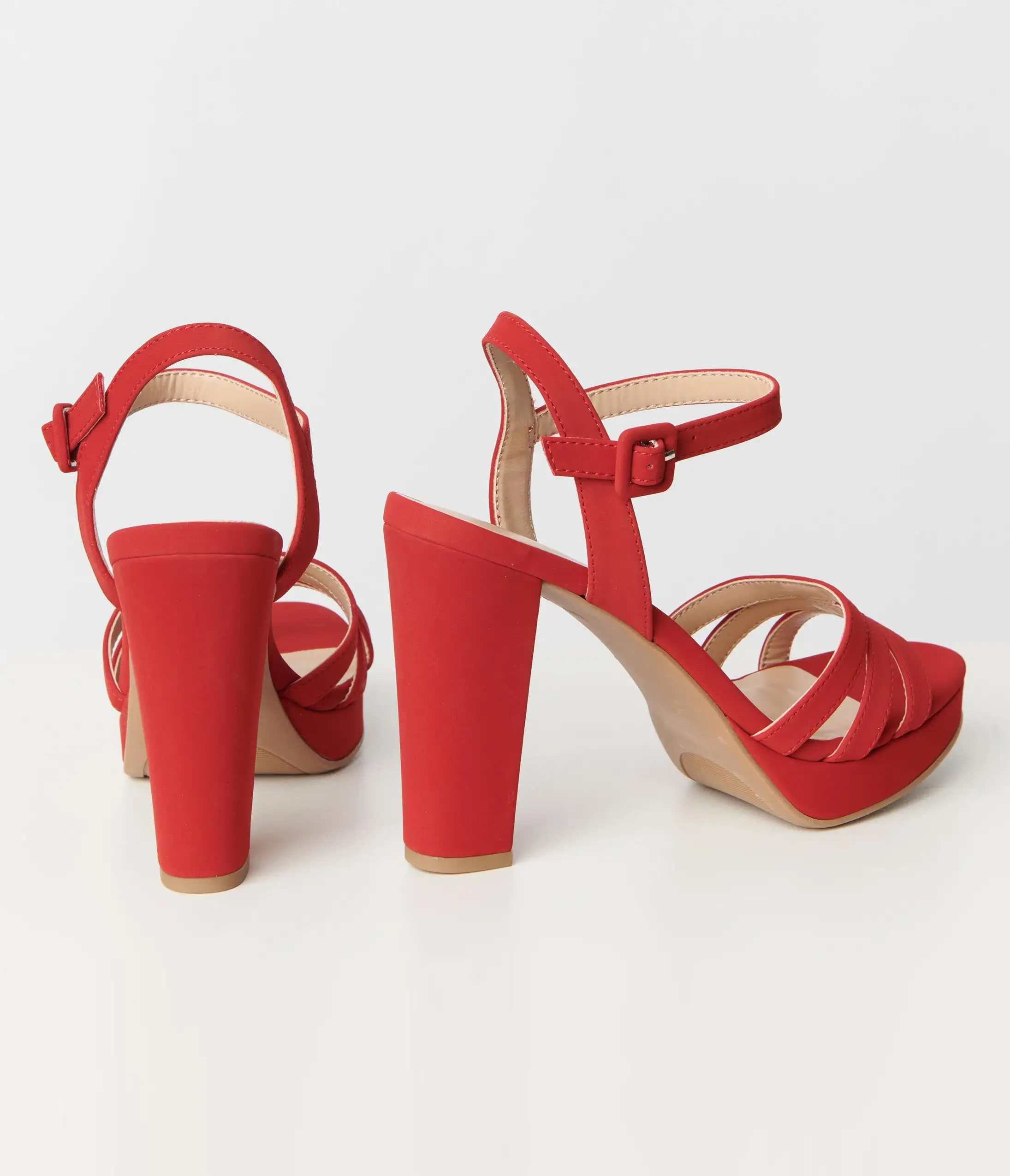 Coming in blazing hot with these stunning pair of platforms crafted in a bright red leatherette. Boasting a 1 inch platform and 4.5 inch lift, the open toe sandal design is secured with a gored and adjustable square buckle ankle strap.
