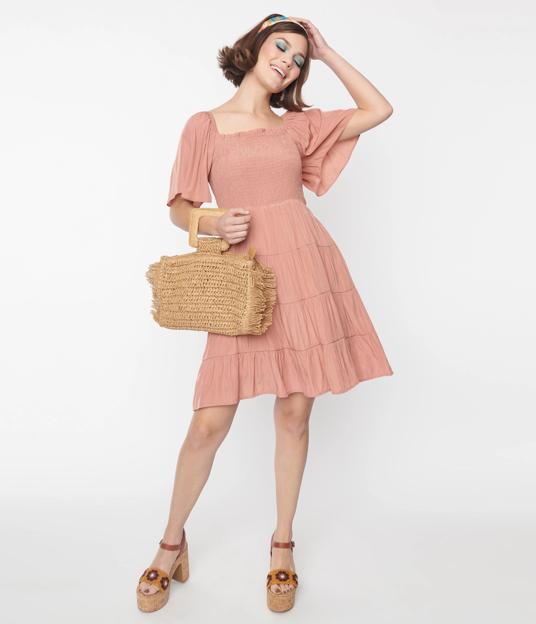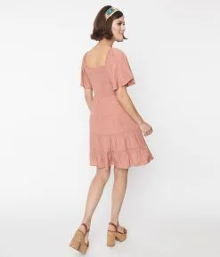 This darling mini A-Line dress is set in a lovely clay red woven. Outfitted with a smocked bodice, short flutter sleeves, and a tiered skirt. Complete with elastic shoulders for a comfortable fit!