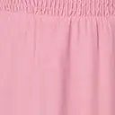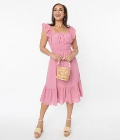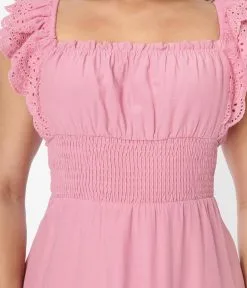 This charming midi dress is crafted in a dusty rose woven. Outfitted with a smocked waist and an elastic scoop neckline. Complete with a lace eyelet hem and matching flutter straps.