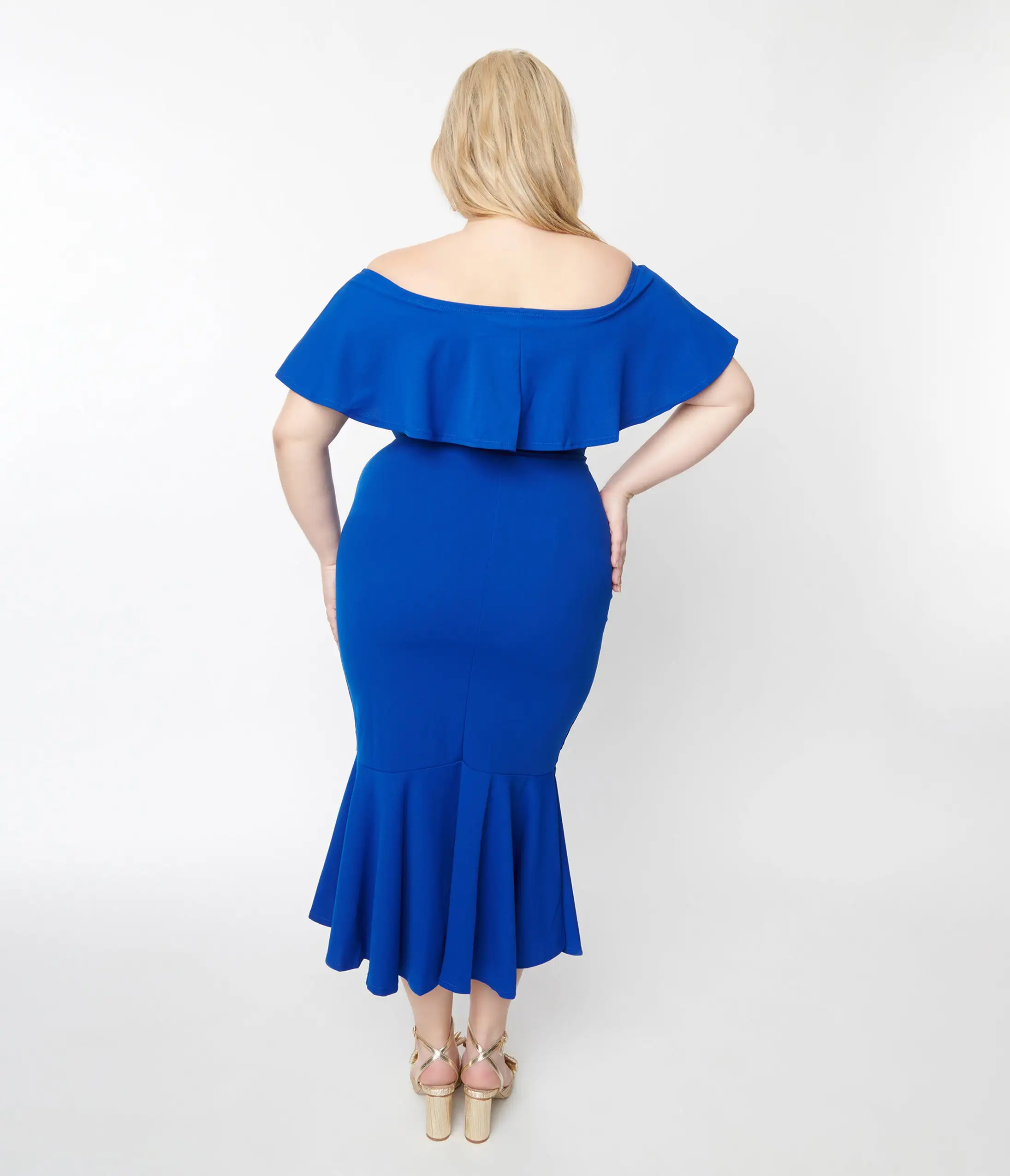 This stunning plus size off-the-shoulder dress is crafted in a royal blue knit with a feminine and flirty ruffle midi hemline. The off-the-shoulder neckline adds a touch of glamour and sophistication to the dress while the ruffled hemline enhances its flirty and playful vibe. Its versatile style allows you to dress it up with elegant heels and accessories, or dress it down with sandals for a more casual look.