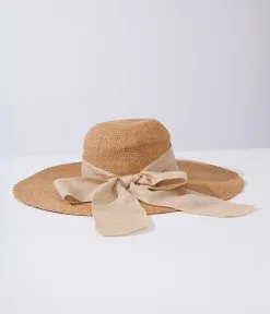Tan toyo braided sun hat with beige bow. Complete with adjustable ties inside the crown that ensures a perfect fit.