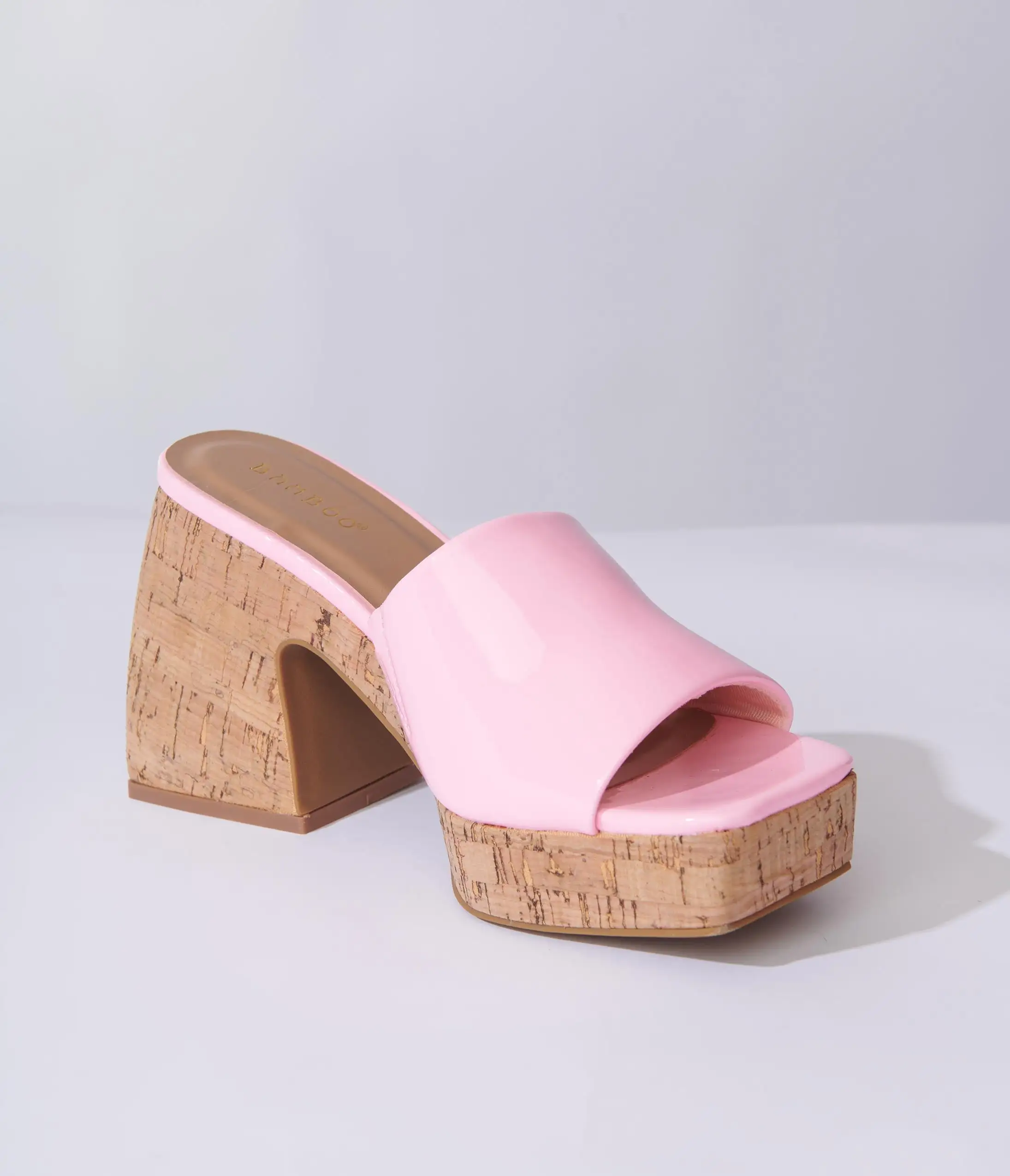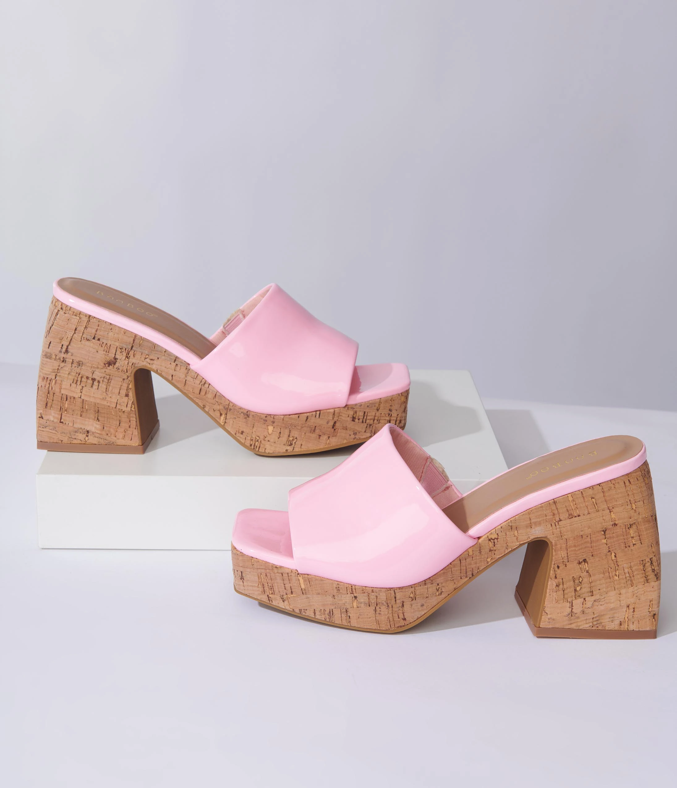 Crafted in a pink patent leatherette and cork, these lovely platform mules feature a 4 inch heel and 1.25 inch platform.