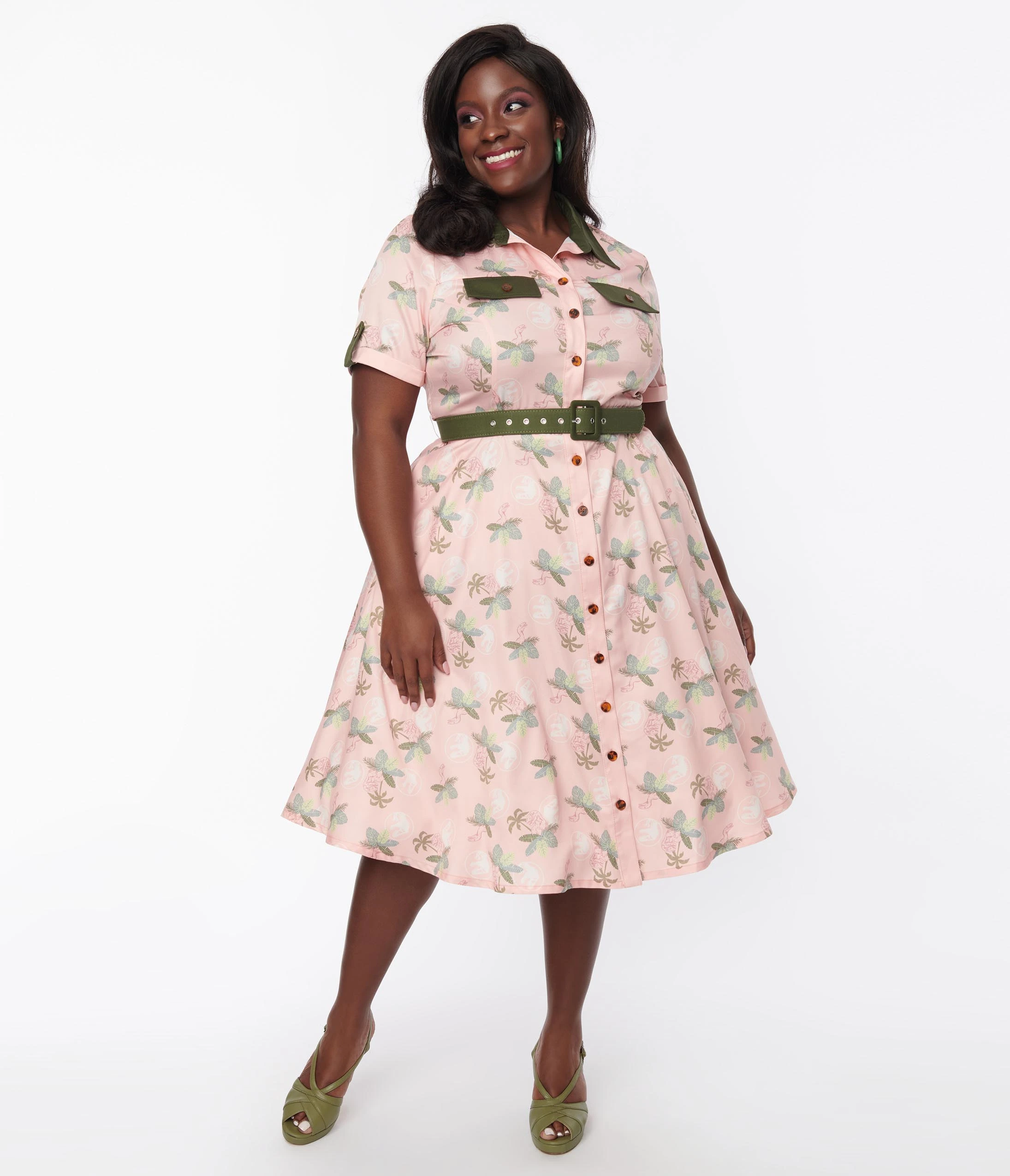 For the wild and the bold, dears! Show off your dino-mite flare in this adorable 1950s style swing dress from Unique Vintage. The Shadia Dress is a fabulous collaboration with Jurassic Park that boasts a marvelous print of dino friends and palms. The button up front bodice features a sweet collar, framed by charming short sleeves while the seamed waist is cinched with a belt. The seeping swing skirt is outfitted with side pockets for all your prehistoric needs!