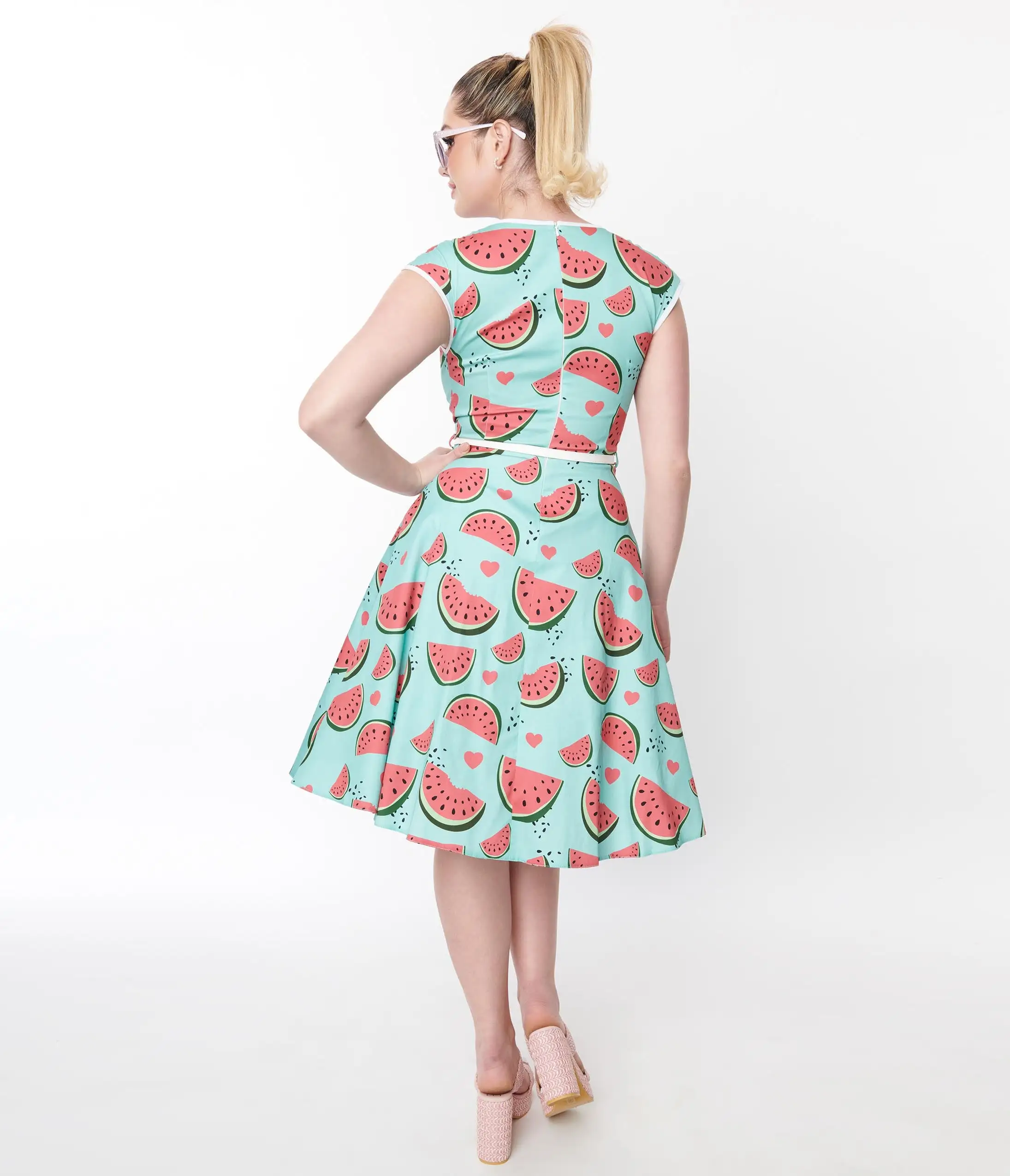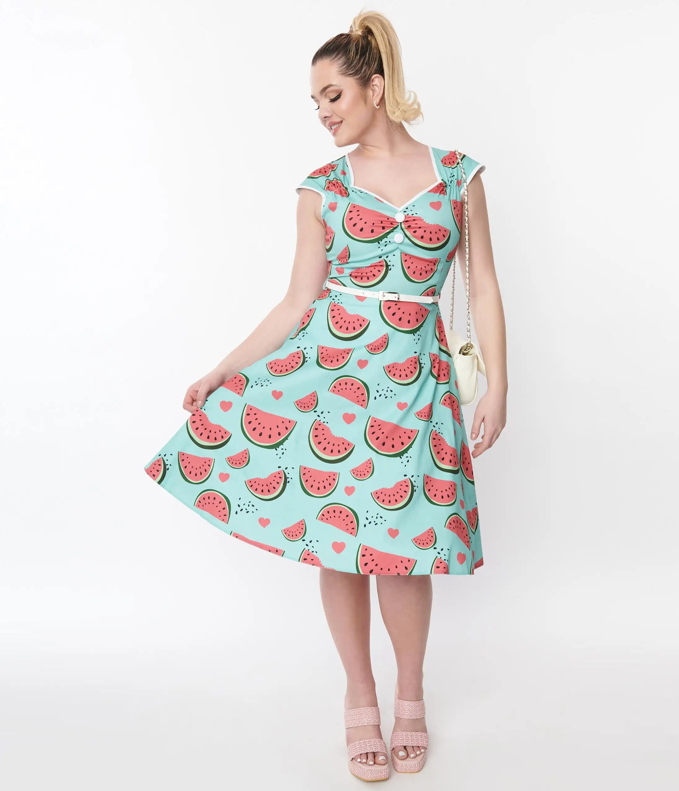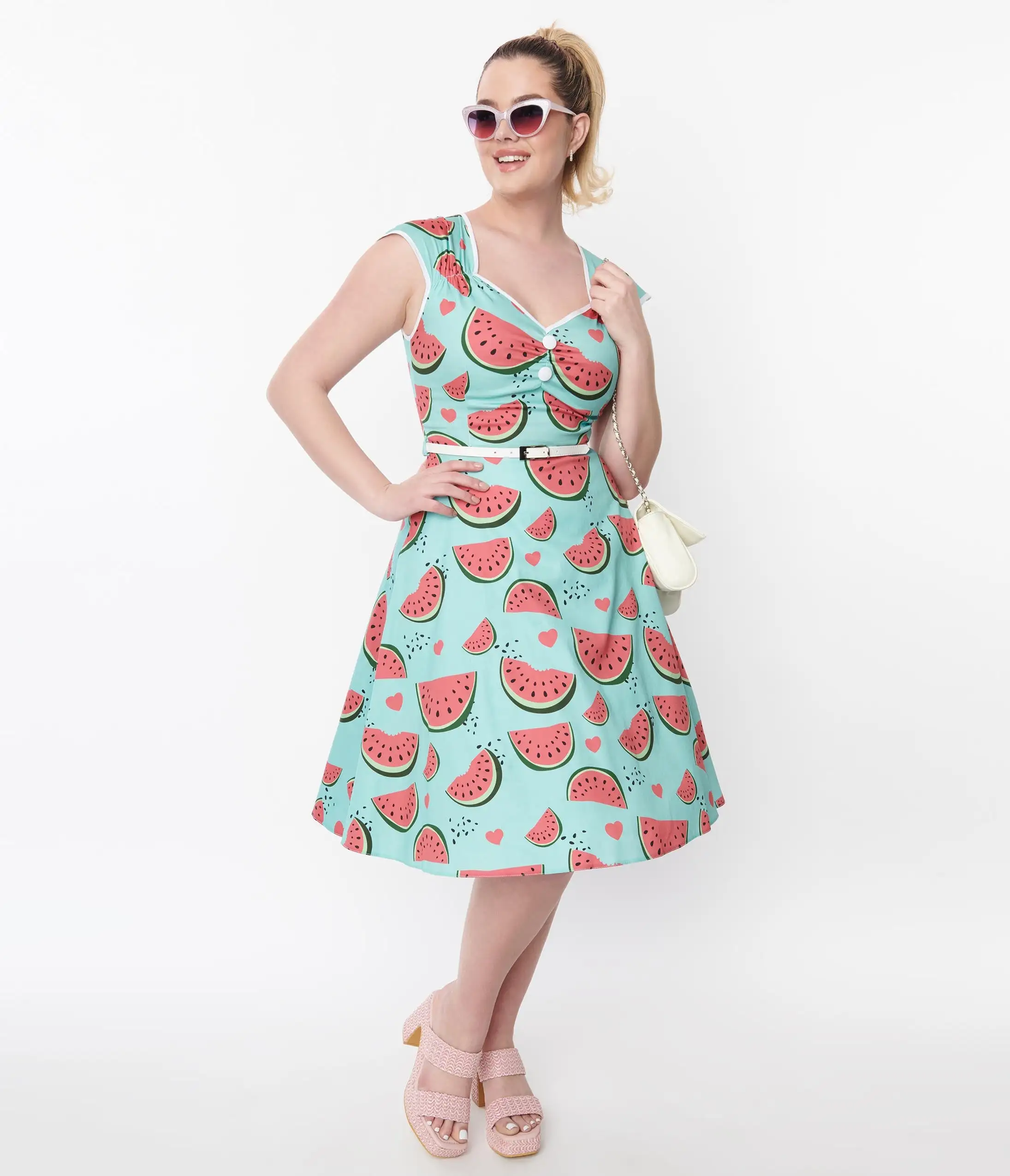 Step out in style with this gorgeous aqua swing dress featuring watermelons throughout that’s sure to turn heads. The short sleeves and sweetheart neckline add a touch of elegance to this beautiful piece. Complete with faux front buttons, belt, and back zipper.