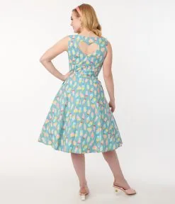 This sweet 1950s style swing dress is crafted in a teal woven fabric dancing with mouthwatering ice cream throughout. Complete with a side zipper, side pockets, and a lovely heart cutout back detail.