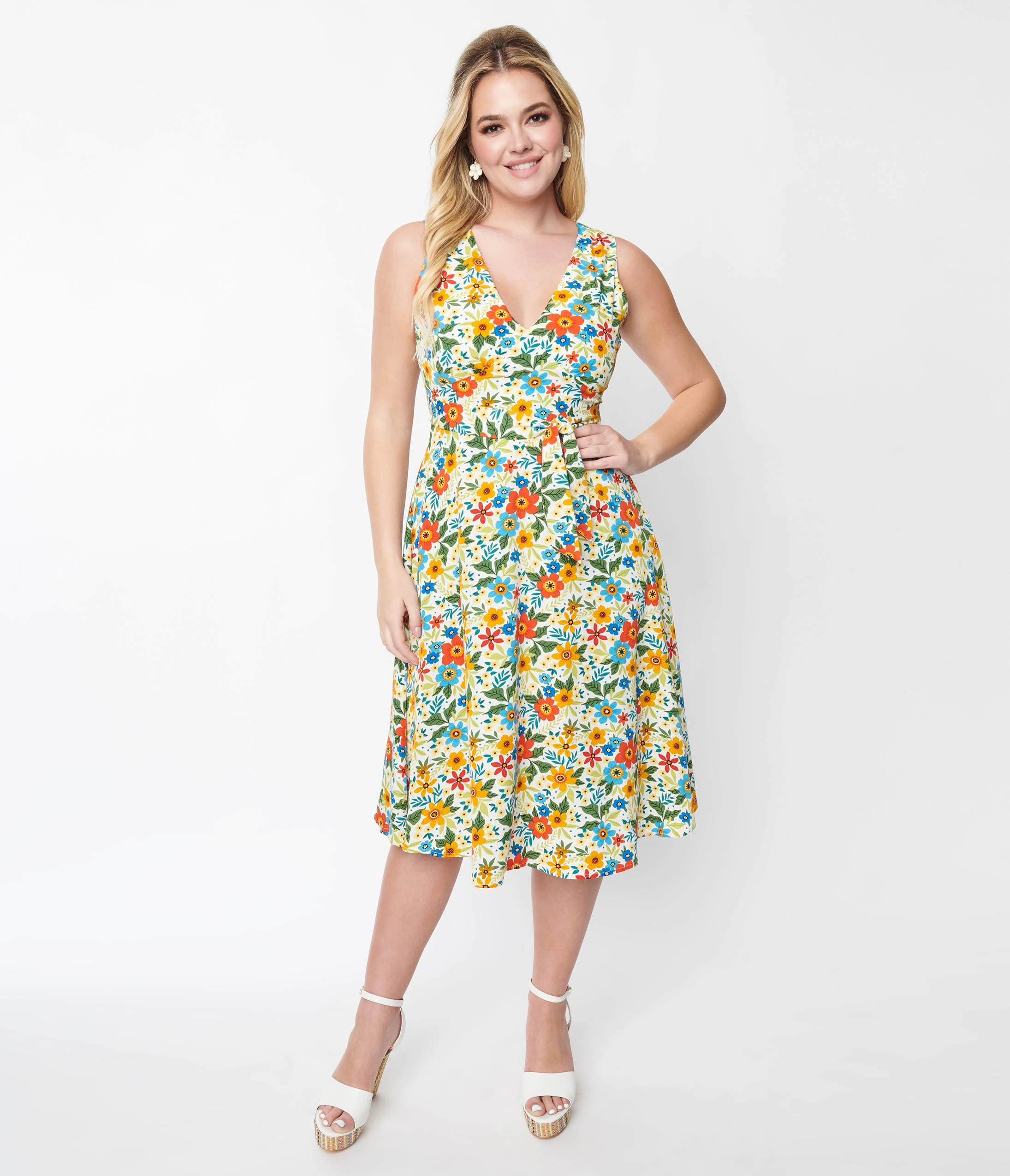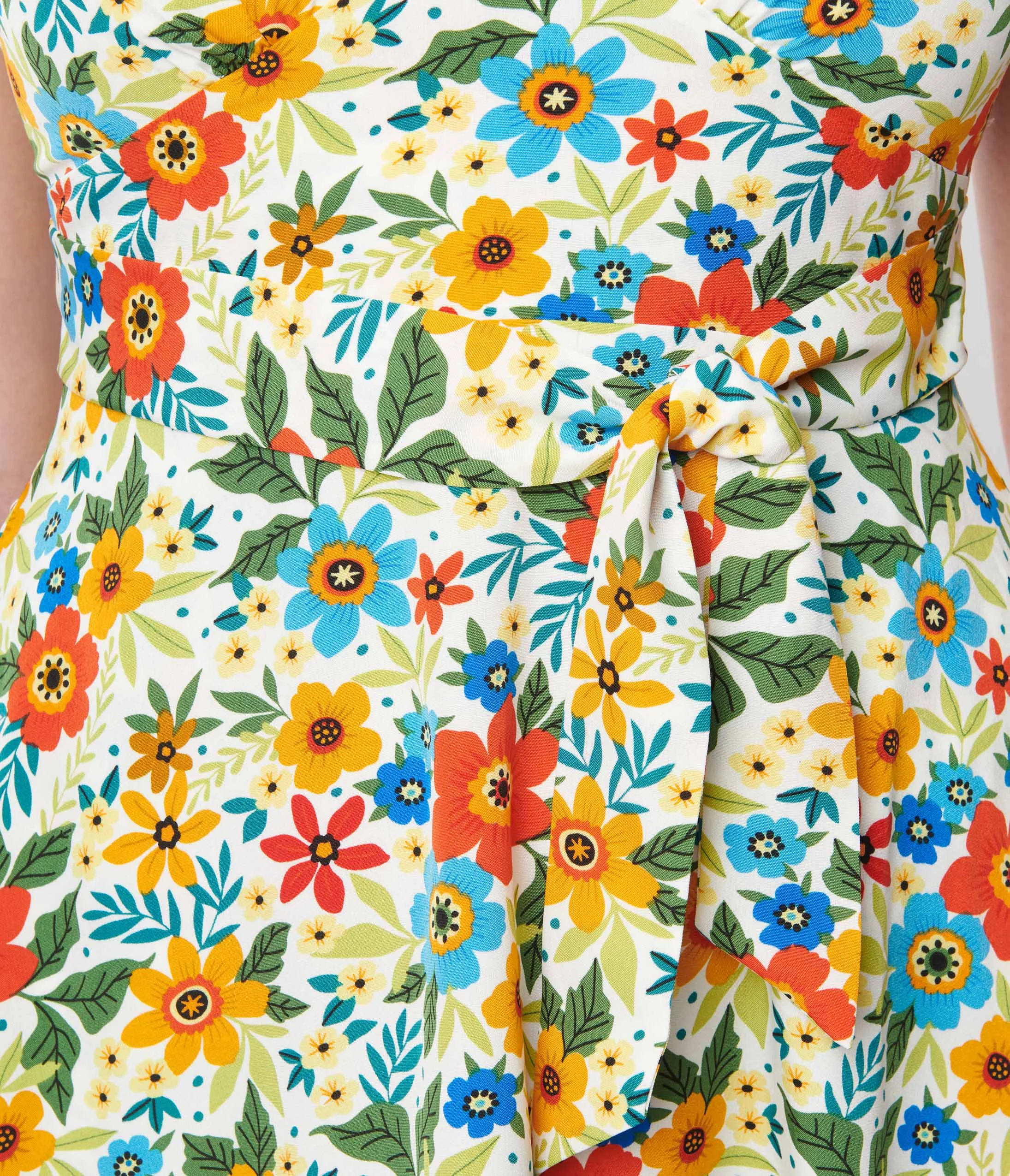 This lovely 1950s style swing dress is set in an ivory woven and dances with multicolor florals throughout. Outfitted with a V neckline and a matching self-tie sash. Complete with a back zipper and side pockets.
