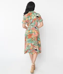 Explore the tropical jungle with this 1950s style midi dress! Crafted in a blue woven and boasting wild toucans, cheetahs, parrots, leaves, and florals throughout. Outfitted with a button down closure leading to a collared neckline. Complete with a matching belt!