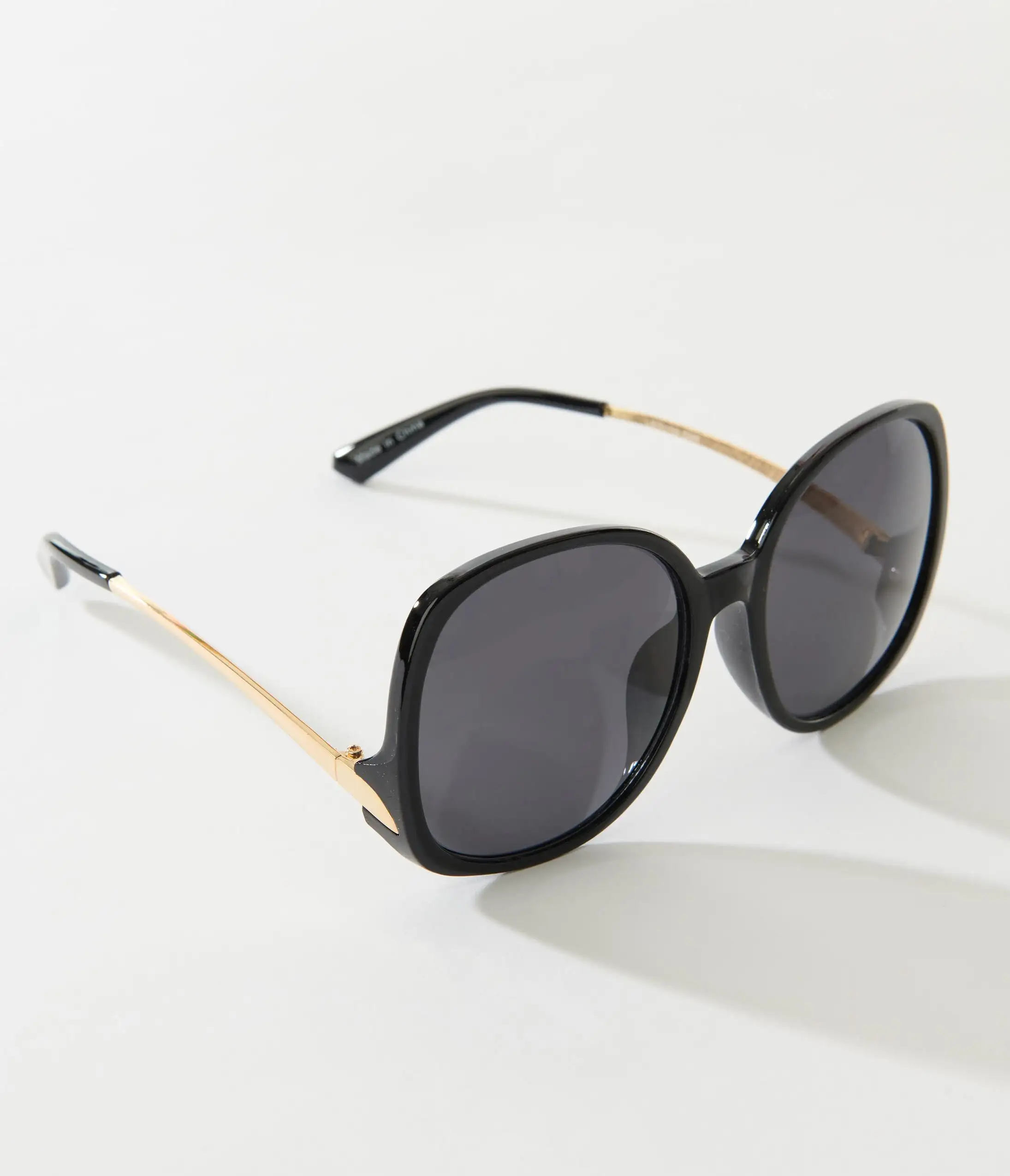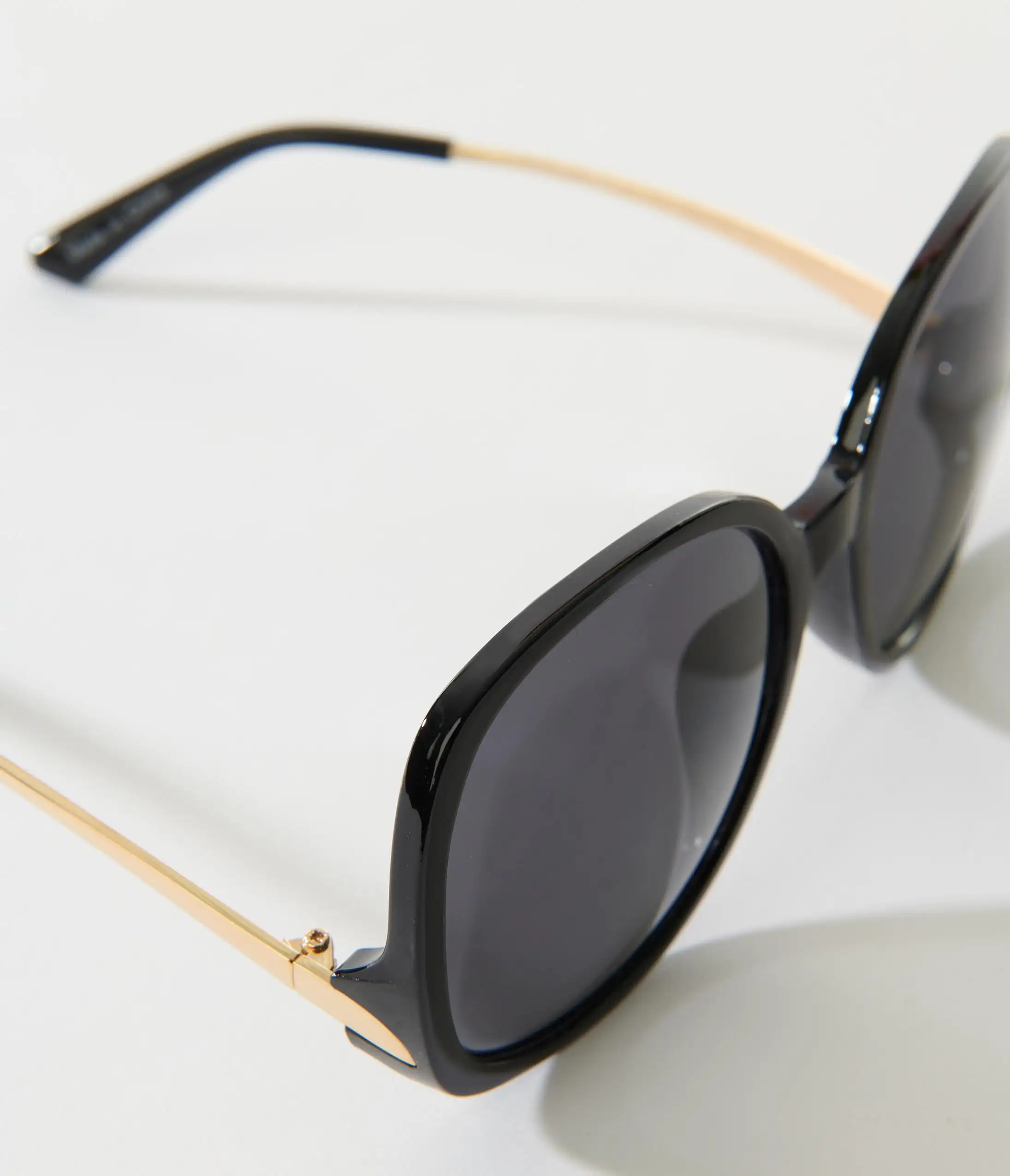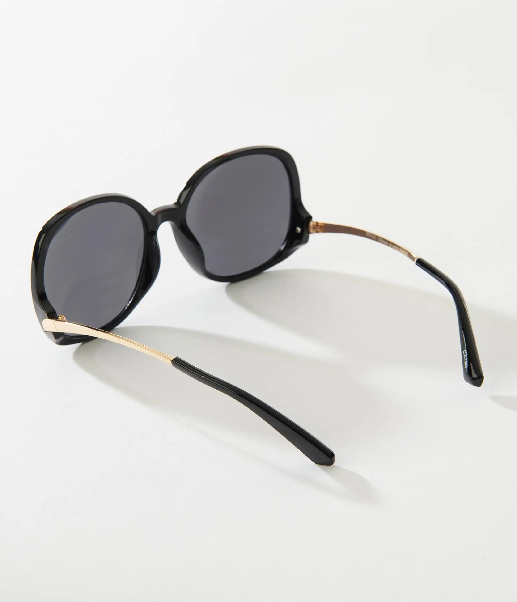 Black bug eye shaped sunglasses with dark tinted lenses. Complete with molded nose and curved arms.