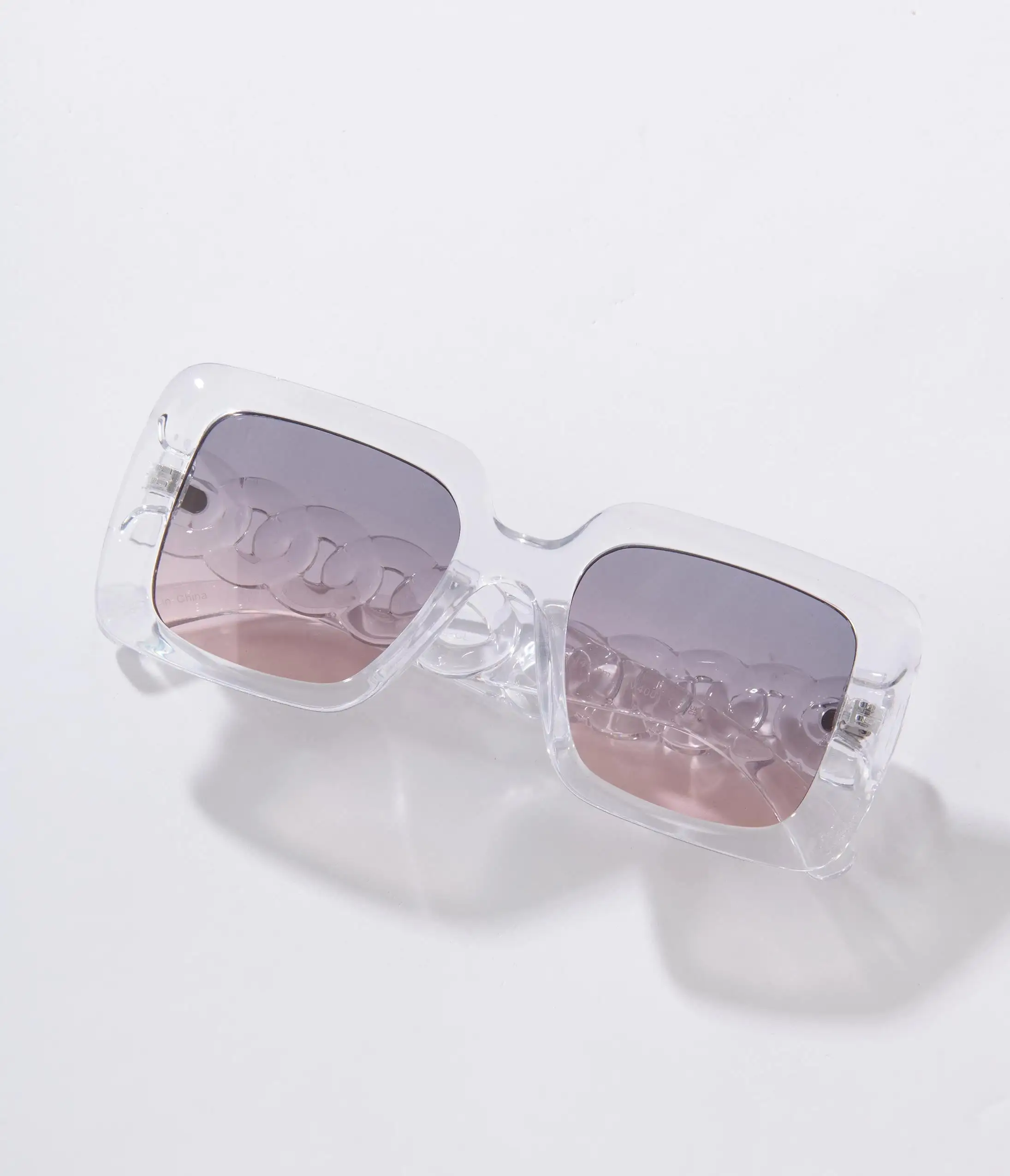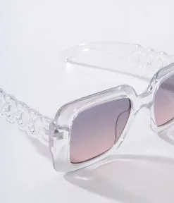 Clear square shaped sunglasses with pink ombre tinted lenses. Complete with molded nose and chain link curved arms.