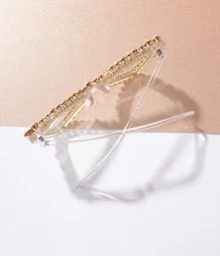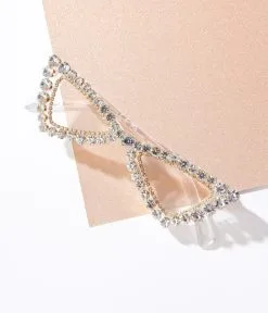 Clear cat eye shaped sunglasses with silver rhinestones and gold setting. Complete with molded nose and curved arms.