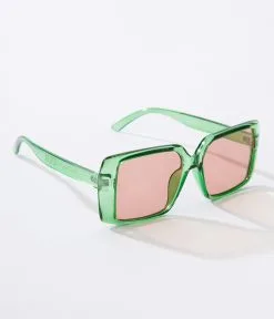 Green square shaped sunglasses with orange tinted lenses. Complete with molded nose and curved arms.