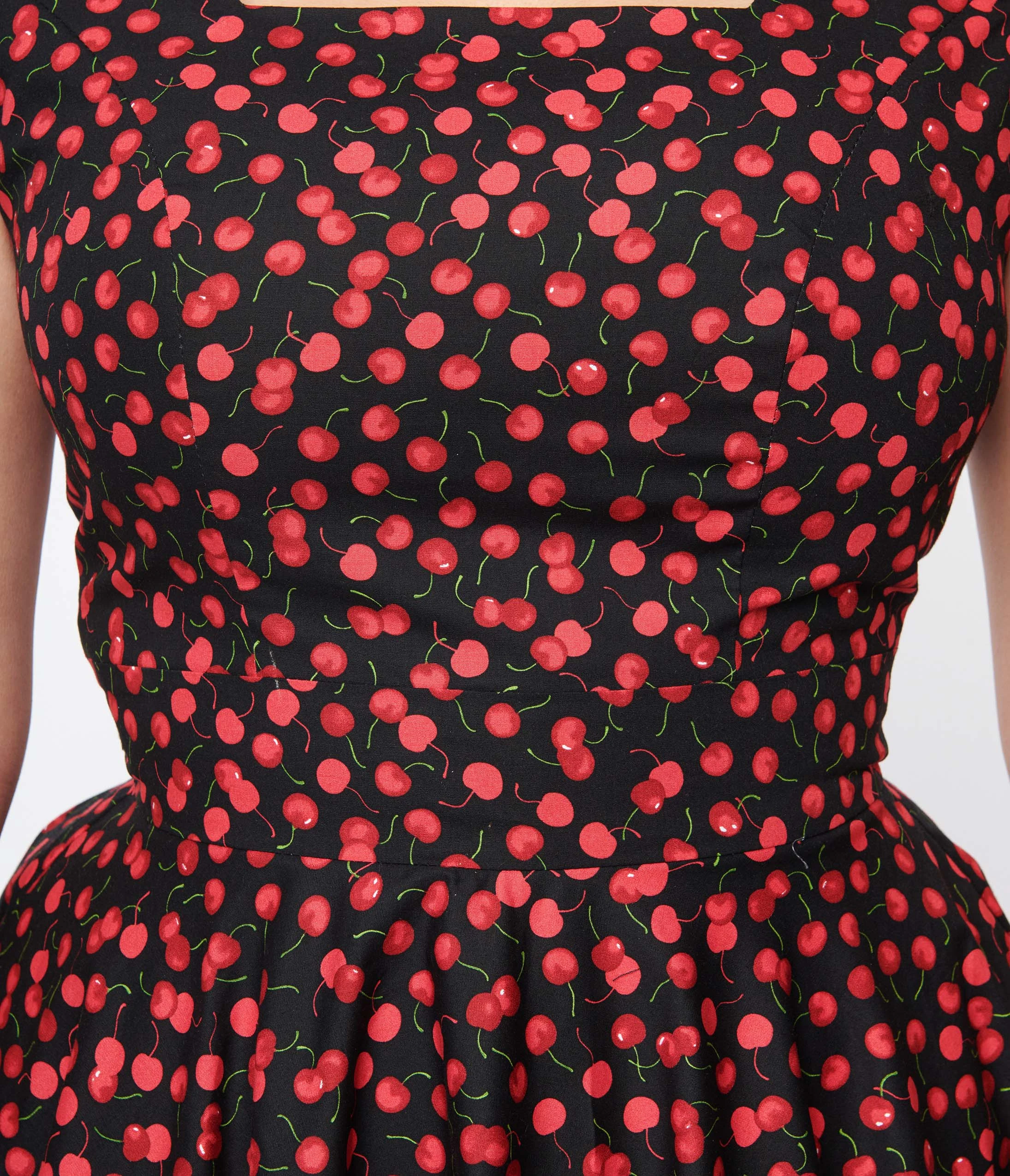This charming 1950s swing dress is set in a black woven dancing with sweet cherries throughout. Outfitted with a square neckline and short cap sleeves. Complete with a back zipper!