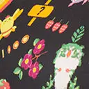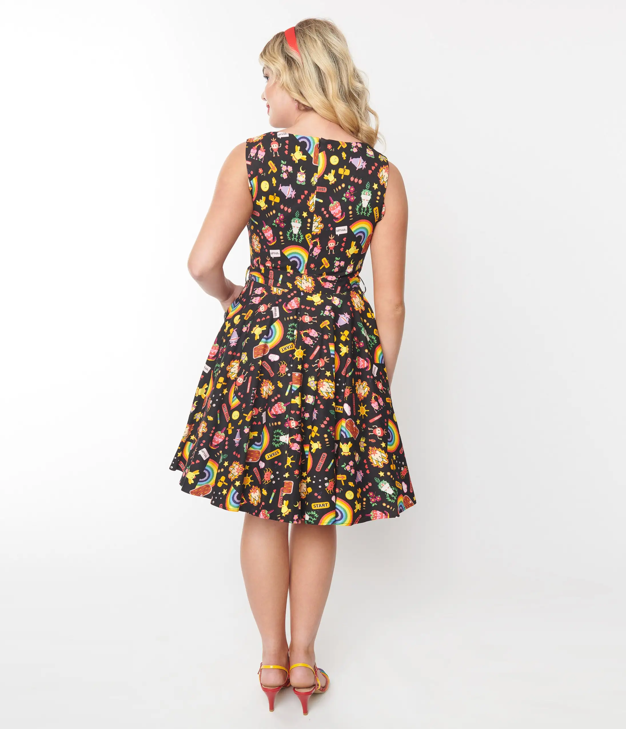 This charming 1950s style fit and flare dress is set in a black woven dancing with adorable 8 bit characters throughout. Outfitted with a back zipper and self-tie sash to cinch the waist perfectly. Complete with side pockets.