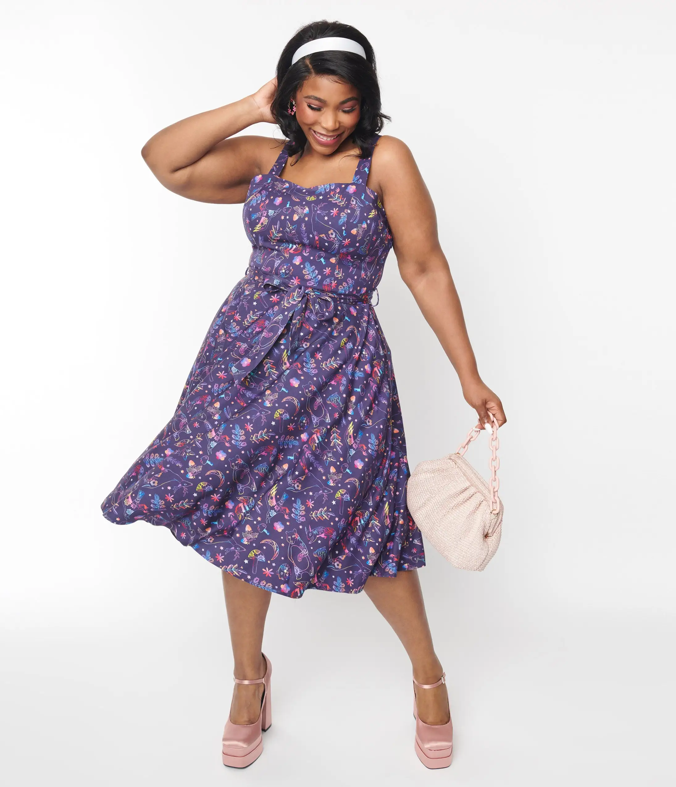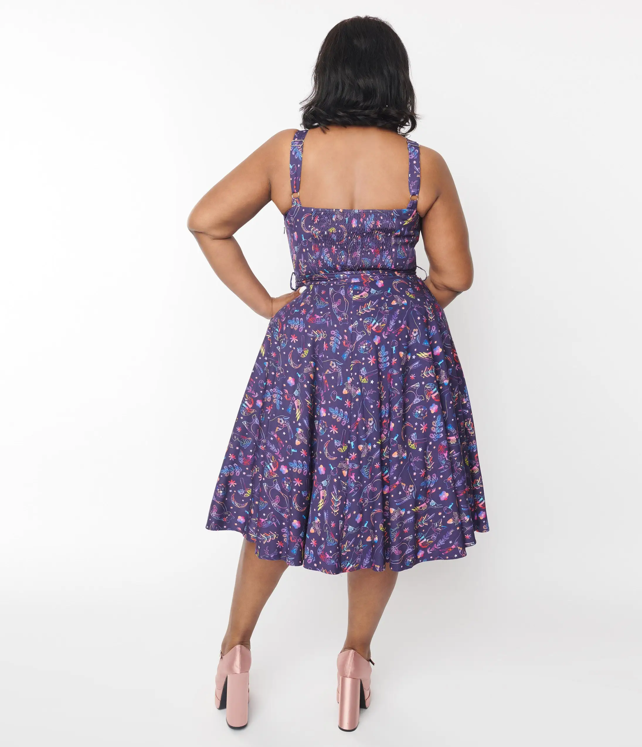 This mystical swing dress is crafted in a deep purple knit and boasts a flurry of rainbow animals, plants, moons, and stars throughout. Outfitted with a smocked back, adjustable straps, and a matching sash. Complete with a side zipper and side pockets.