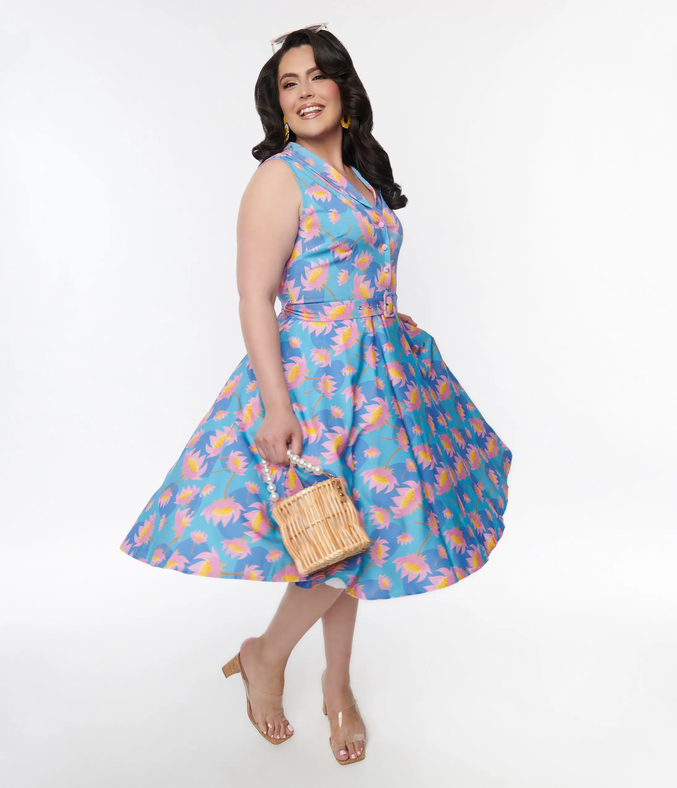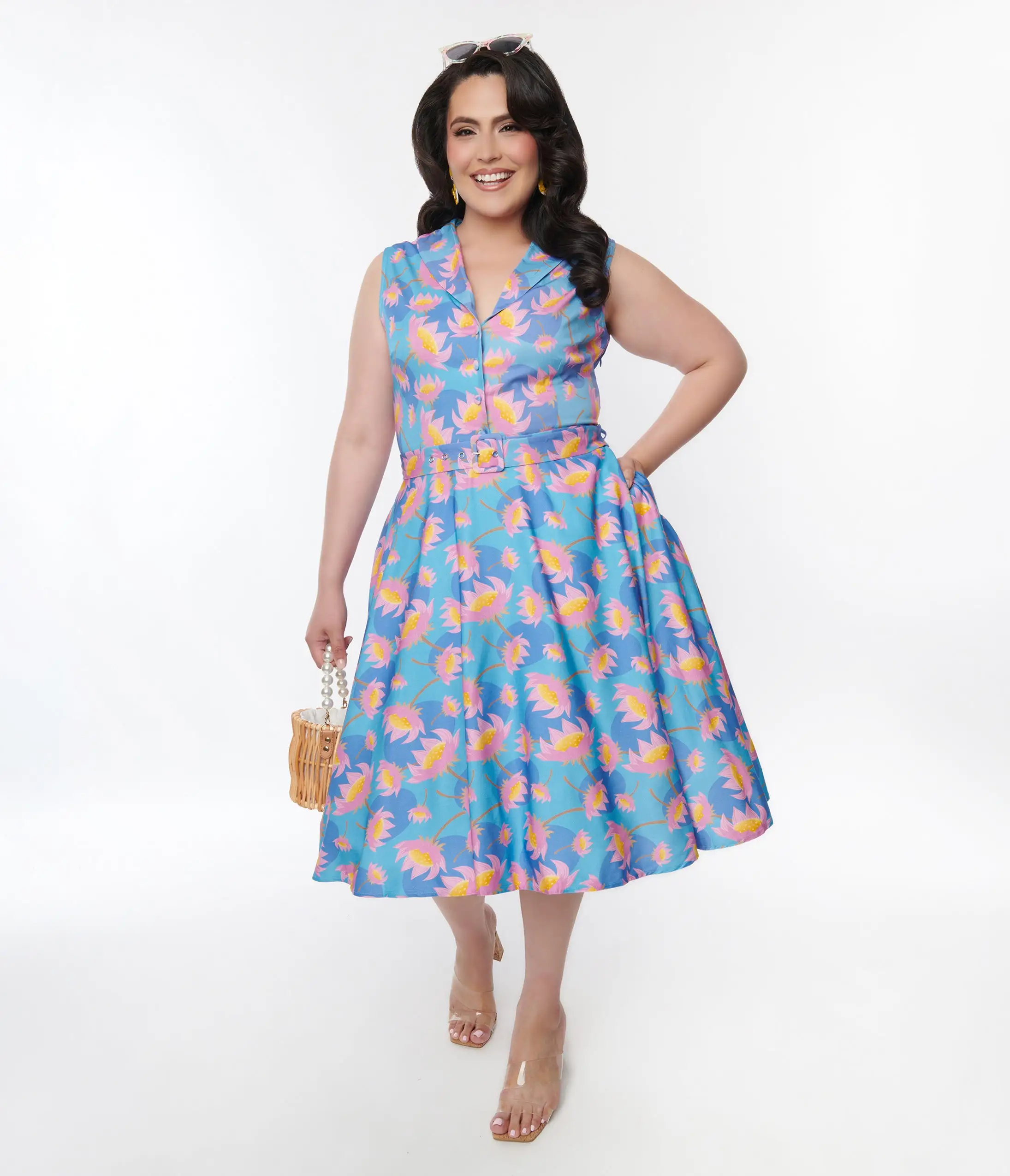 This beautiful 1950s style plus size swing dress is set in a blue knit dancing with purple lotus flowers throughout. Outfitted with a side zipper and partial button up. Complete with a matching belt!