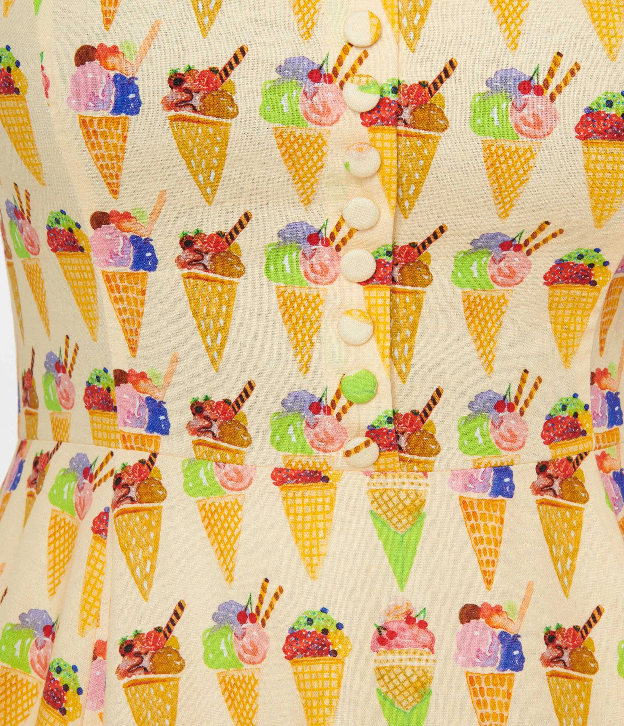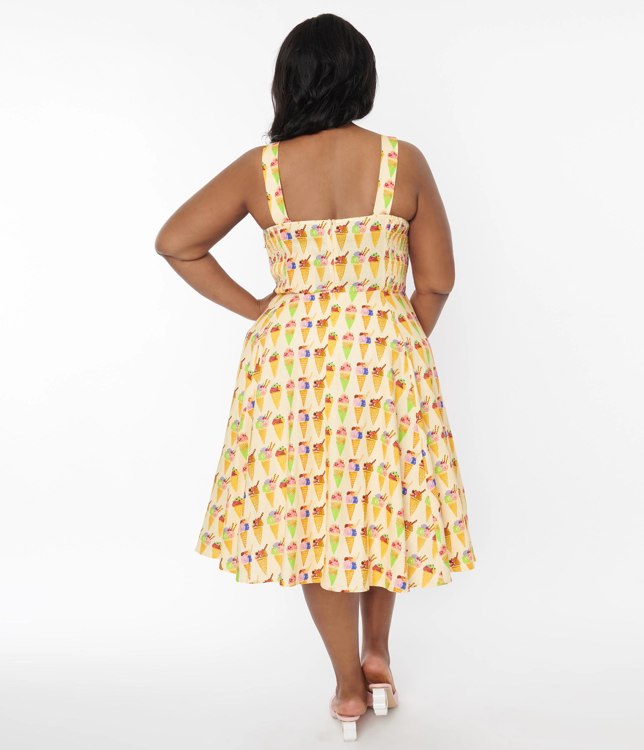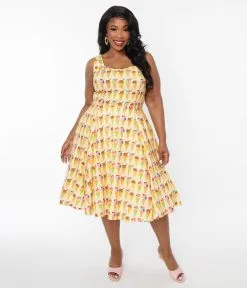 Hey sugar! This sweet 1950’s inspired plus size dress is crafted in a yellow woven fabric and features multicolored ice cream throughout. This sleeveless fit and flare dress features a back zipper and side pockets.