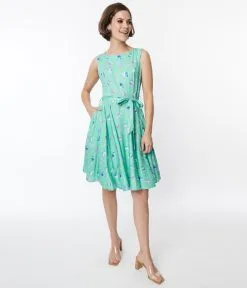 Dive into the ocean with us! This charming 1950s style fit and flare dress is set in a teal knit dancing with adorable jellyfish and stingrays throughout. Outfitted with a back zipper and self-tie sash to cinch the waist perfectly. Complete with side pockets.