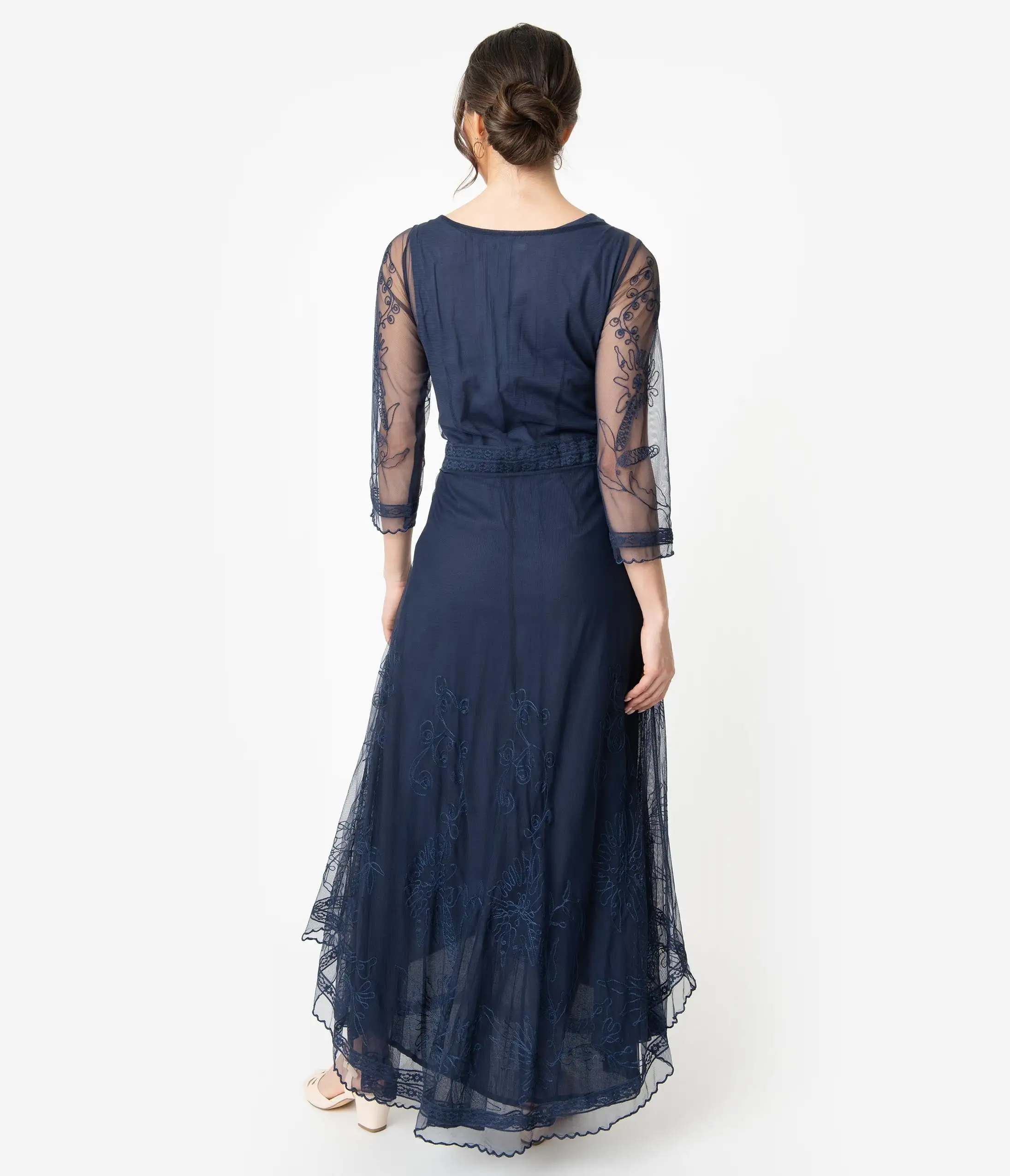 Drink it in, darling! A divinely dreamy Edwardian inspired dress by Nataya, this elegant silhouette is crafted in a delicate soutache embroidered dark royal blue mesh set against matching and removable cotton lining for a graceful accent. Boasting elegant and ethereal period details, a sultry scoop neckline provides a dash of modern marvel while the sheer three-quarter length sleeves provide luxurious style. The long form drops to a statement making high low hemline while the beautifully shaped split skirt overlay flows about your figure. Outfitted with a side zipper to flatter your shape, romantic is an understatement!