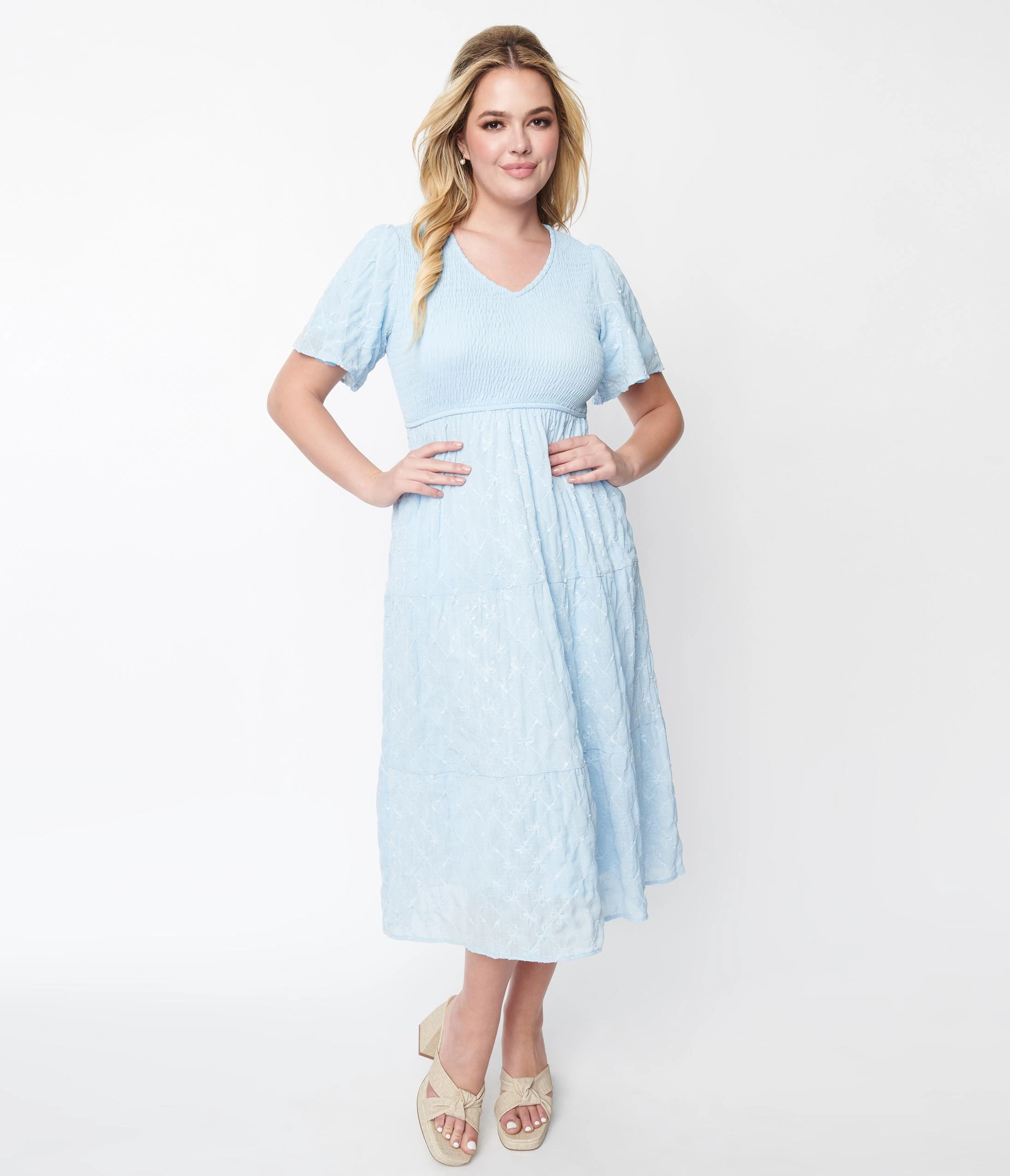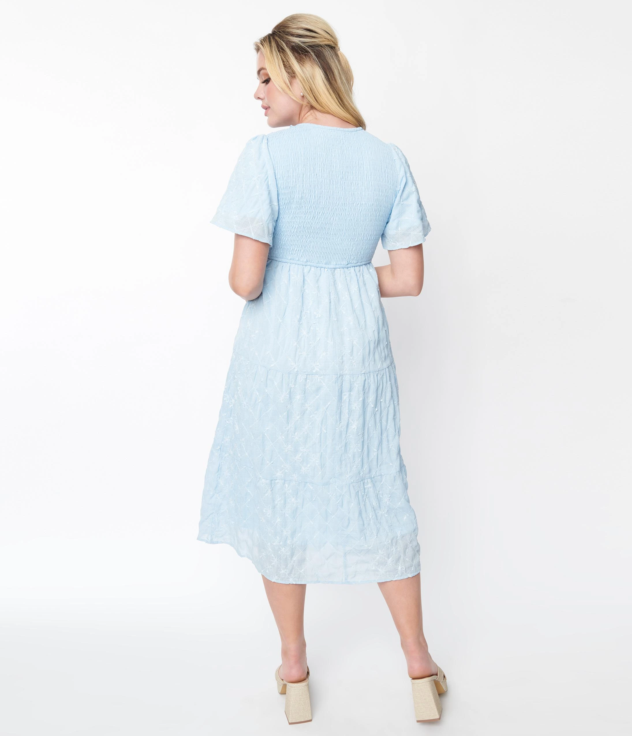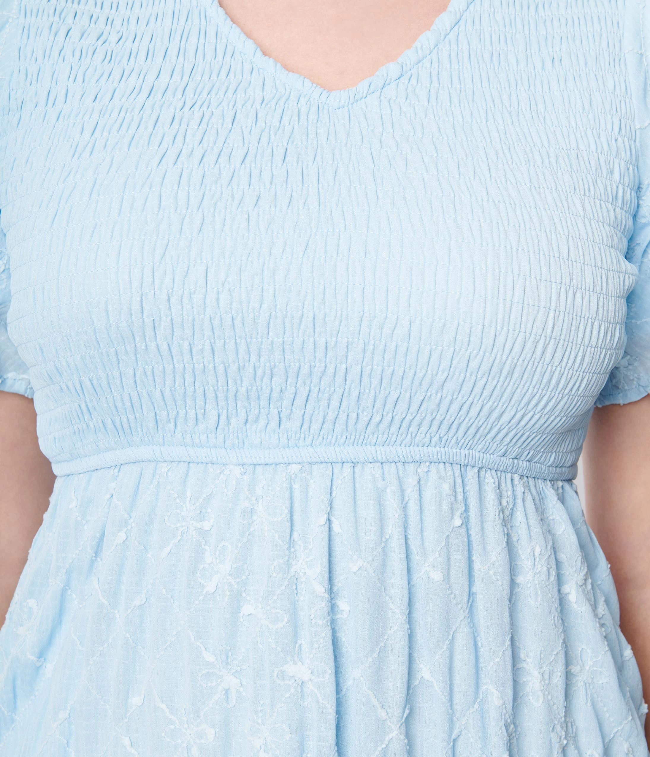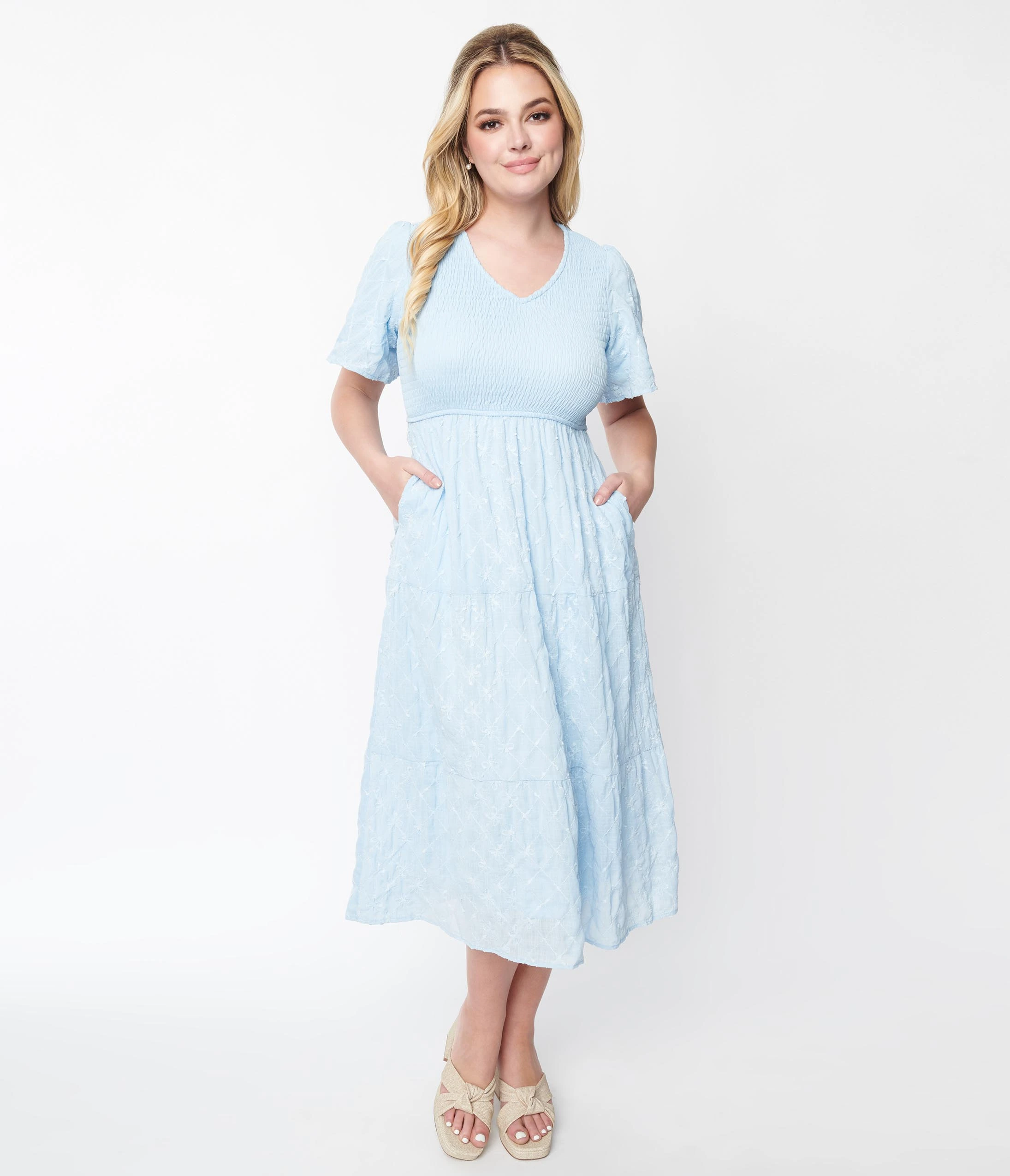 This absolutely darling midi dress is crafted in a baby blue woven. The smocked bust is framed with floral diamond detailed sleeves matching its skirt. Complete with side pockets!