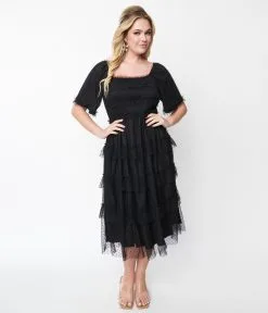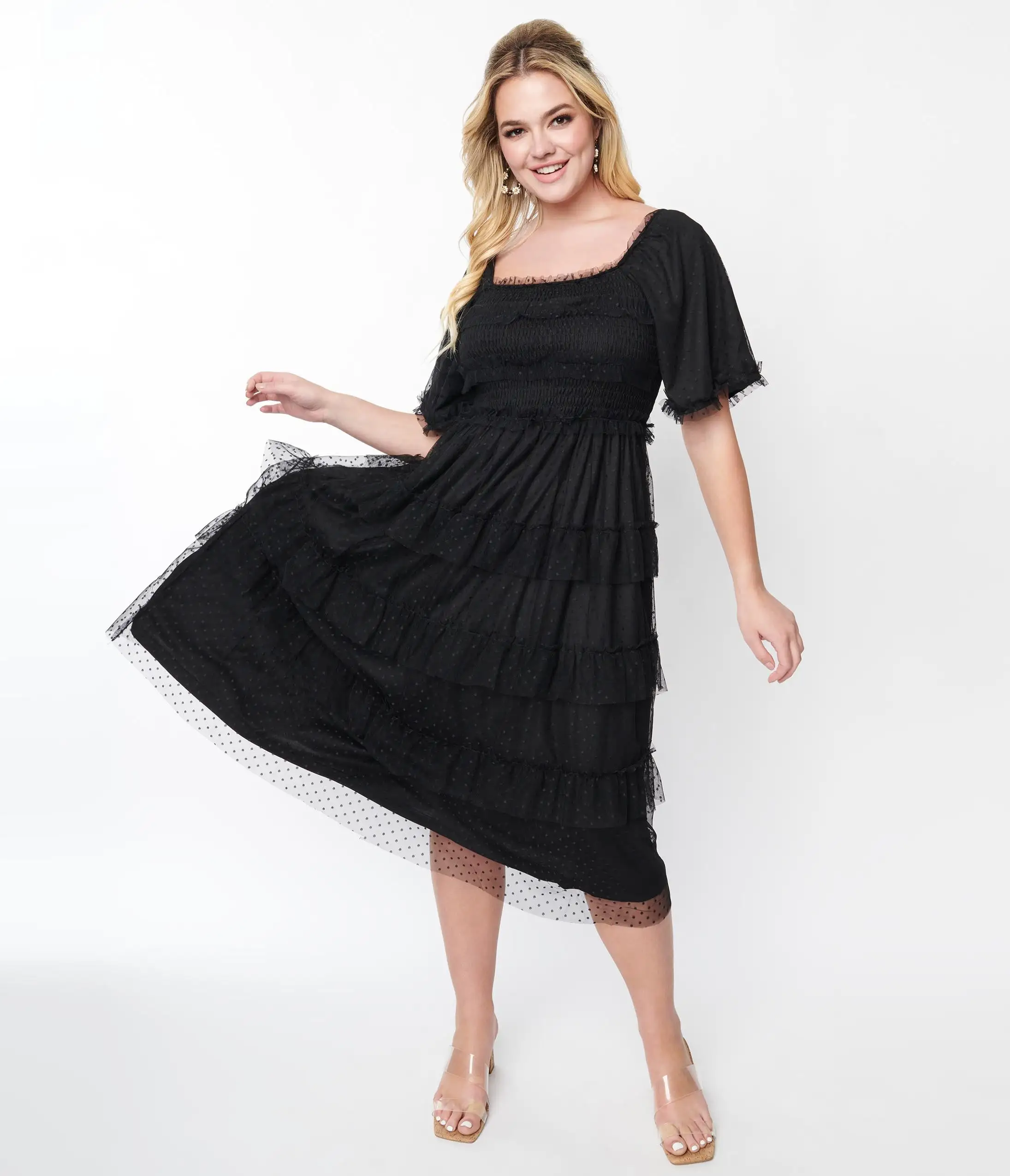 This black tiered ruffle dress is a stylish and elegant dress that is perfect for a variety of occasions. Crafted in a black woven fabric and featuring a scoop neckline with short sleeves. Featuring multiple tiers of ruffles that cascade down the length of the dress, creating a beautiful and flowy look.