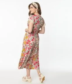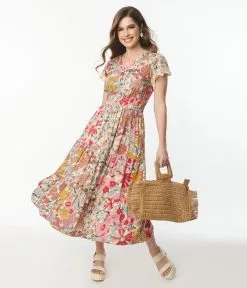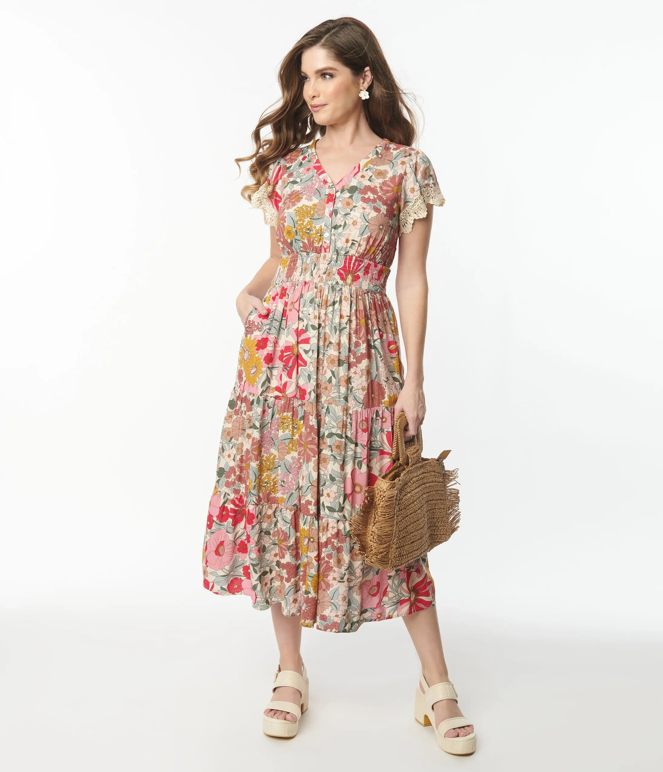 This gorgeous midi dress is crafted in a soft and lightweight woven that features florals in shades of pink, yellow, and mauve cascading throughout an ivory backdrop. Outfitted with a V-neckline that is anchored by short sleeves trimmed with white ivory lace. Complete with a button down front that leads to an elastic ruched waist and side pockets.